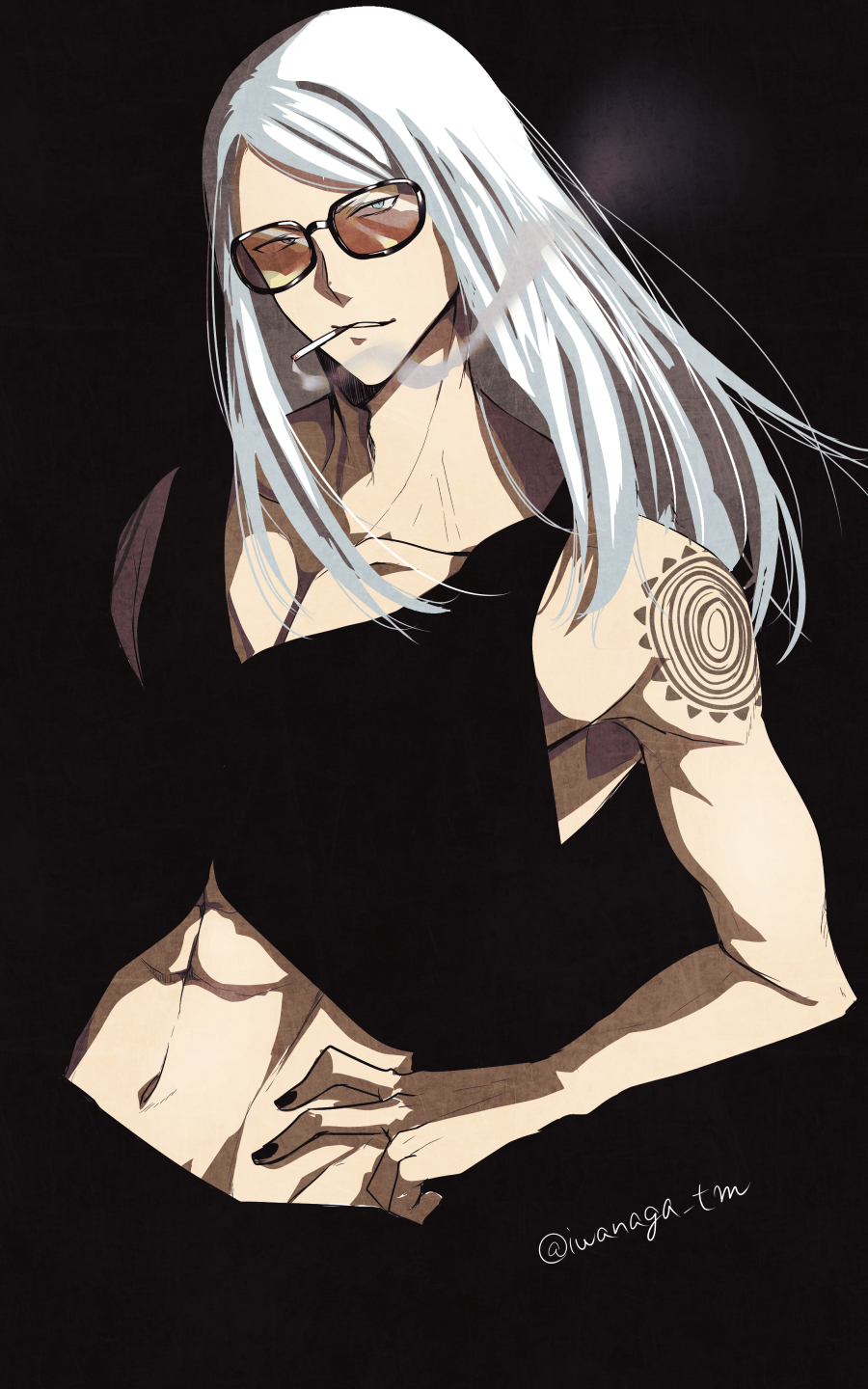 1boy abs alternate_color alternate_hair_color arm_tattoo artist_name bare_shoulders black_nails black_shirt cigarette collarbone fate/grand_order fate_(series) flapper_shirt hand_on_own_hip highres iwanaga_tm long_hair looking_at_viewer male_focus midriff nail_polish orange-tinted_eyewear pectoral_cleavage pectorals shirt shoulder_tattoo simple_background sleeveless smoke solo sunglasses tattoo tezcatlipoca_(fate) tinted_eyewear upper_body