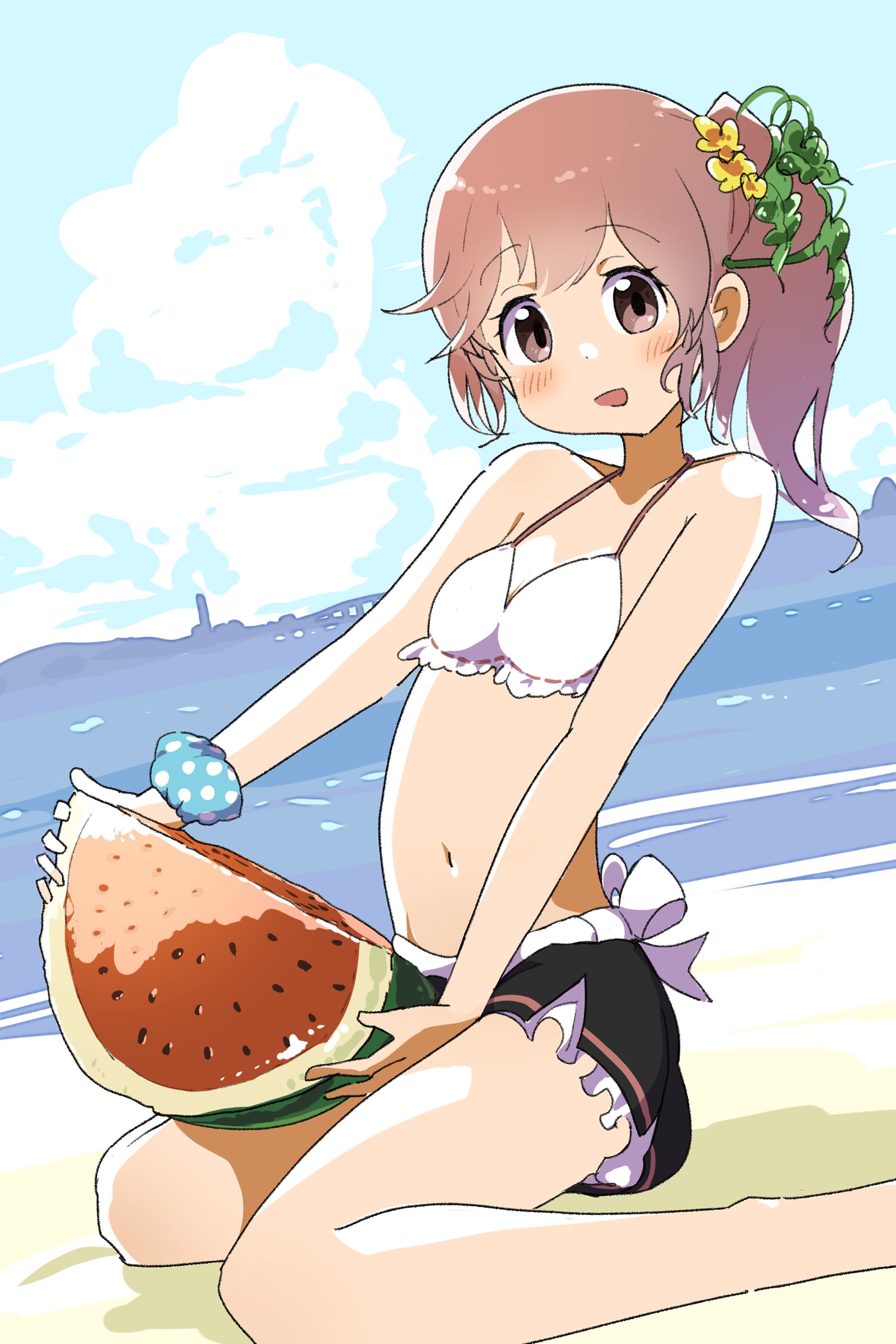 1girl absurdres alternate_costume bare_shoulders beach bikini bikini_top_only black_shorts blush flower food frilled_shorts frills fruit hair_flower hair_ornament highres holding holding_food holding_fruit holding_fruit iwa_(iwafish) kemono_friends kneeling midriff nana_(kemono_friends) navel ocean pink_eyes short_shorts shorts side_ponytail sidelocks solo swimsuit watermelon white_bikini