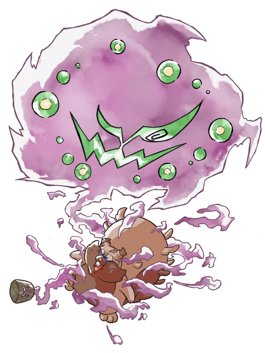 @_@ closed_eyes cursed fangs full_body gen_4_pokemon gen_8_pokemon greedent green_eyes highres looking_at_another looking_down nintendo no_humans onigiri_debu open_mouth pain pokemon pokemon_(creature) simple_background spiritomb tail white_background