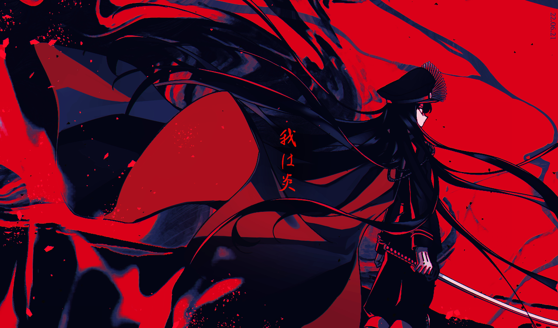 1girl clenched_hand closed_mouth dated expressionless fate/grand_order fate_(series) floating_cape floating_hair gloves hat highres holding holding_sword holding_weapon katana koha-ace limited_palette long_hair long_sleeves looking_afar oda_nobunaga_(fate) oda_nobunaga_(koha-ace) peaked_cap red_background red_eyes sempon_(doppio_note) sidelighting simple_background solo sword very_long_hair weapon