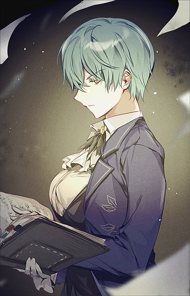 1girl angela_(project_moon) ascot black_ascot black_feathers blue_coat blue_hair book breasts brooch closed_mouth coat collared_shirt feathers gem holding holding_book jewelry large_breasts library_of_ruina long_sleeves looking_down munjiduck project_moon reading shirt short_hair solo upper_body white_ascot white_shirt wing_collar yellow_gem