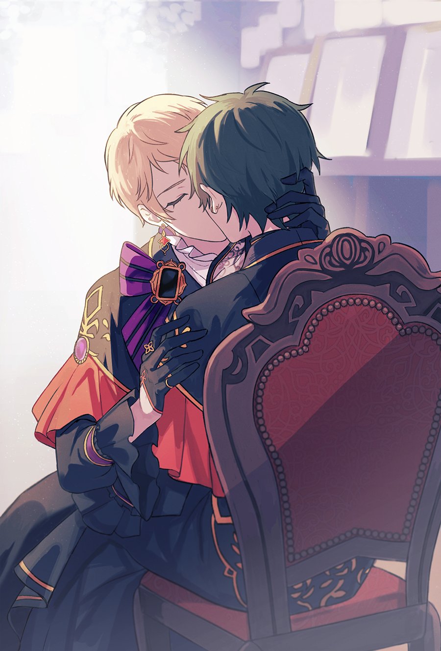 2boys black_gloves black_hair black_pants black_shirt chair closed_eyes ensemble_stars! facing_another gloves hermitage_(ensemble_stars!) highres idol idol_clothes itsuki_shu kagehira_mika kiss long_sleeves male_focus multiple_boys official_alternate_costume pants pink_hair round_o0 shirt short_bangs short_hair sitting yaoi