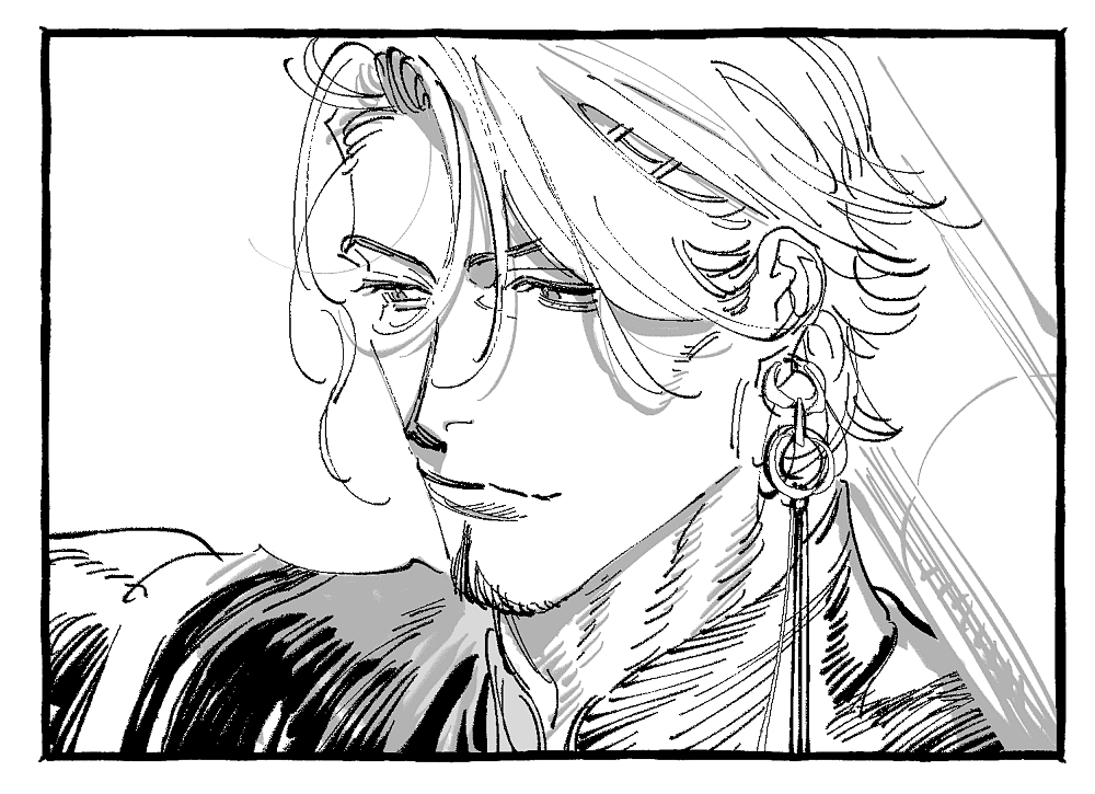 1boy duryodhana_(fate) earrings facial_hair fate/grand_order fate_(series) goatee goatee_stubble holding holding_polearm holding_weapon jewelry mature_male monochrome polearm portrait robin29 short_hair simple_background single_earring sketch stubble upper_body weapon white_background