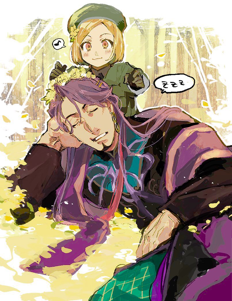 1boy 1girl beret blonde_hair closed_eyes duryodhana_(fate) earrings elbow_rest facial_hair fate/grand_order fate_(series) gloves goatee goatee_stubble green_jacket hat head_rest head_wreath jacket jewelry long_hair long_sleeves lying margot_431 mature_male musical_note on_side paul_bunyan_(fate) purple_hair sash short_hair shoulder_sash single_earring sleeping smile speech_bubble stubble upper_body yellow_eyes zzz