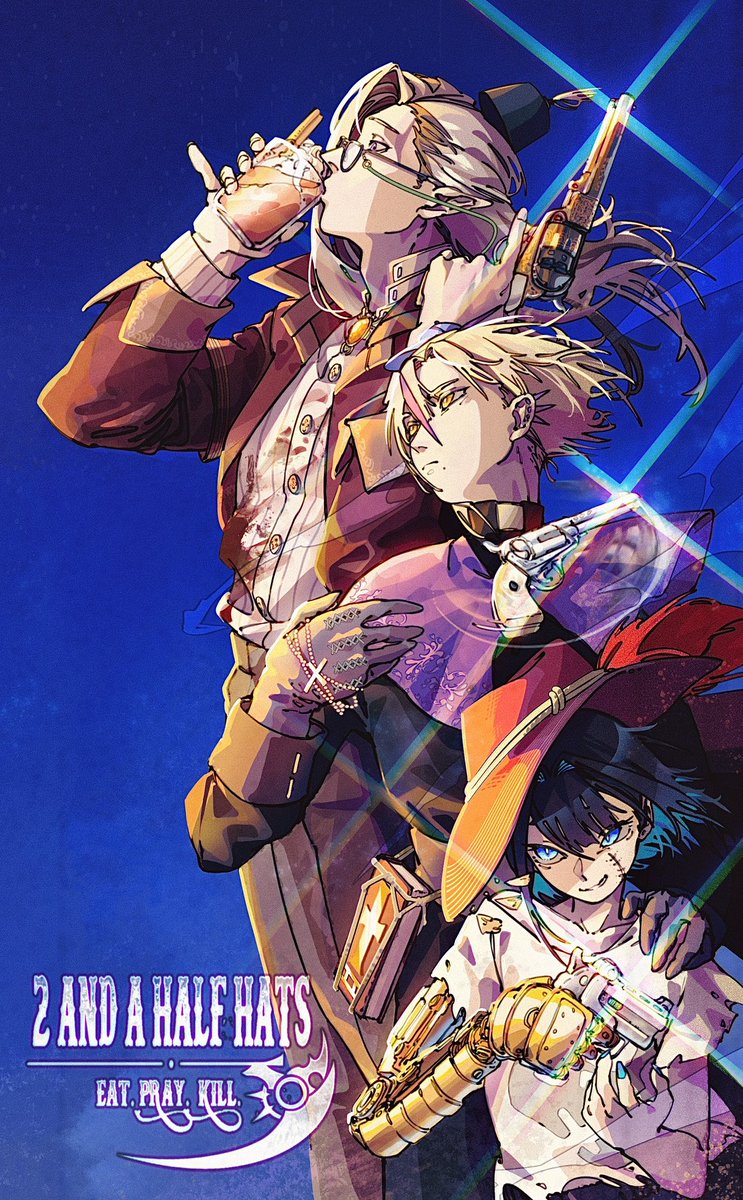 artist_request blue_nails cross drinking fez_hat gun handgun hat highres holding holding_gun holding_weapon hololive hololive_english holostars holostars_english magni_dezmond mechanical_arms noir_vesper non-web_source ouro_kronii priest revolver scar shirt simple_background single_mechanical_arm torn_clothes torn_shirt virtual_youtuber weapon