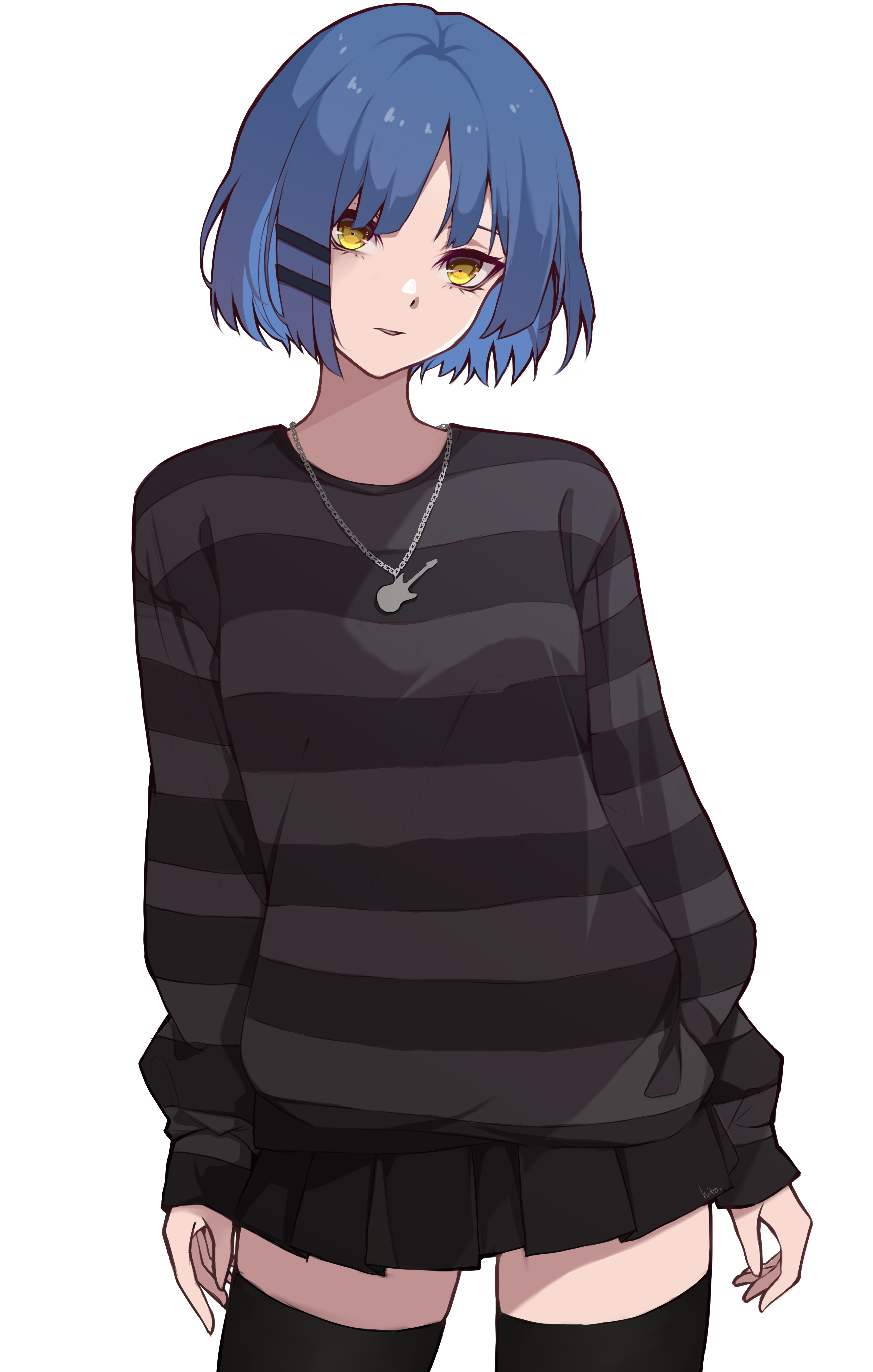 1girl absurdres artist_name black_skirt black_sweater black_thighhighs blue_hair bocchi_the_rock! commentary cowboy_shot highres hitozche jewelry long_sleeves looking_at_viewer miniskirt necklace parted_bangs parted_lips pleated_skirt romaji_commentary short_hair simple_background single_sidelock skirt solo striped_clothes striped_sweater sweater thighhighs white_background yamada_ryo yellow_eyes zettai_ryouiki