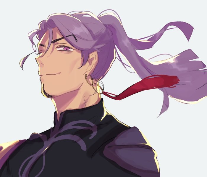 1boy chanyuu05410 duryodhana_(fate) earrings facial_hair fate/grand_order fate_(series) floating_hair goatee goatee_stubble jewelry long_hair looking_at_viewer male_focus mature_male purple_eyes purple_hair simple_background single_earring smile solo stubble upper_body white_background
