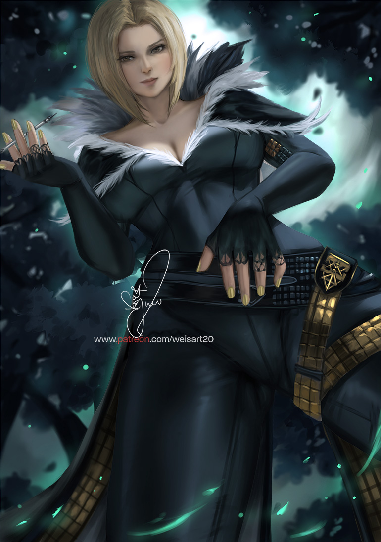 1girl benedikta_harman blonde_hair breasts cleavage closed_mouth cropped_legs feather_collar final_fantasy final_fantasy_xvi fingerless_gloves fur_collar fur_trim gloves hand_on_own_crotch holding holding_smoking_pipe large_breasts leather leather_pants leather_vest looking_at_viewer low_neckline nail_polish pants patreon_logo patreon_username short_hair signature smoking_pipe solo standing vest wei_(promise_0820) yellow_eyes yellow_nails