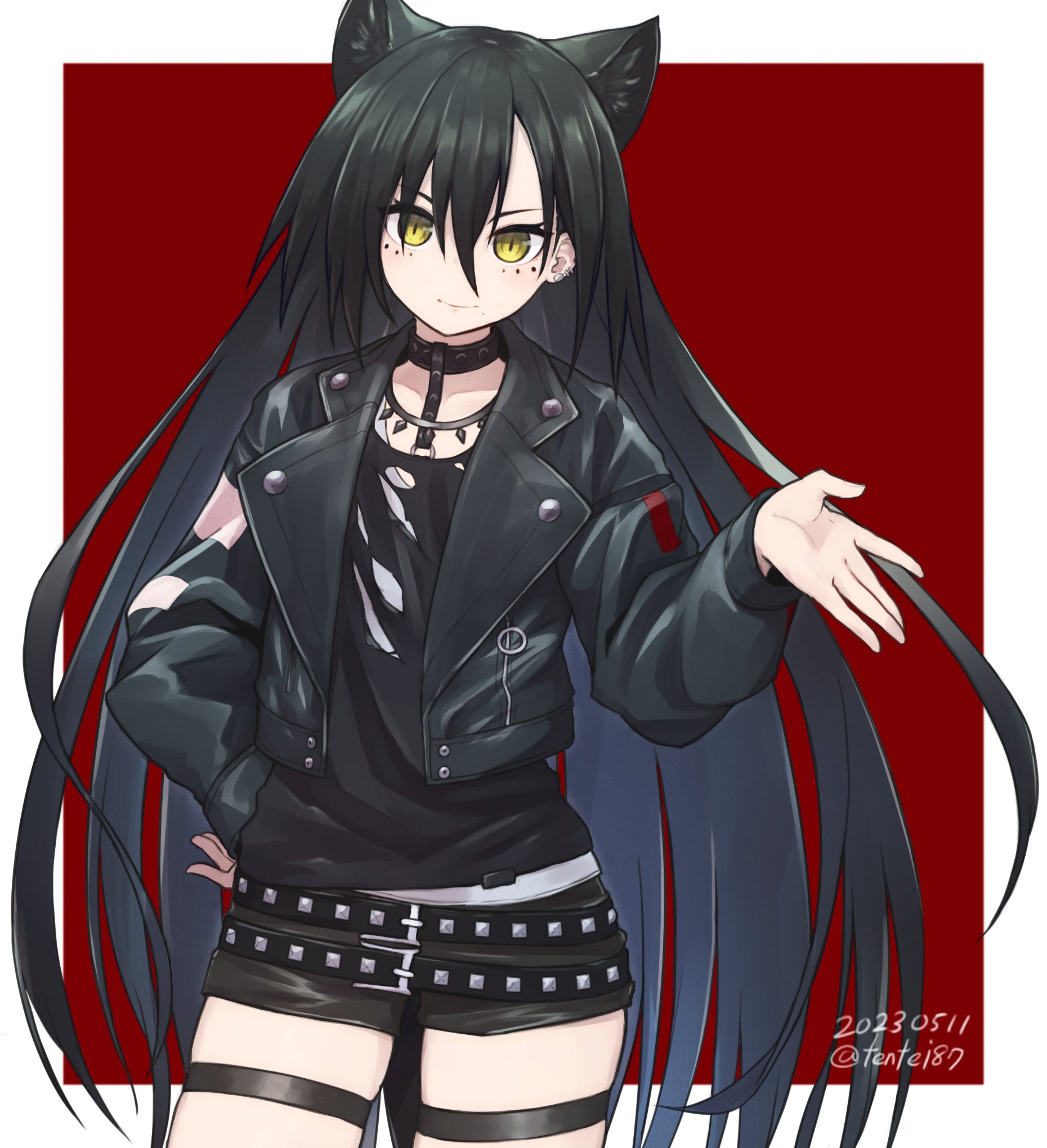 1girl animal_ears arknights belt black_belt black_choker black_hair black_shirt black_shorts border cat_ears cat_girl choker commentary contrapposto cowboy_shot dagda_(arknights) dated hand_up highres long_hair multiple_belts red_background ryota_tentei shirt shorts simple_background slit_pupils solo studded_belt thigh_strap torn_clothes twitter_username undershirt white_shirt yellow_eyes