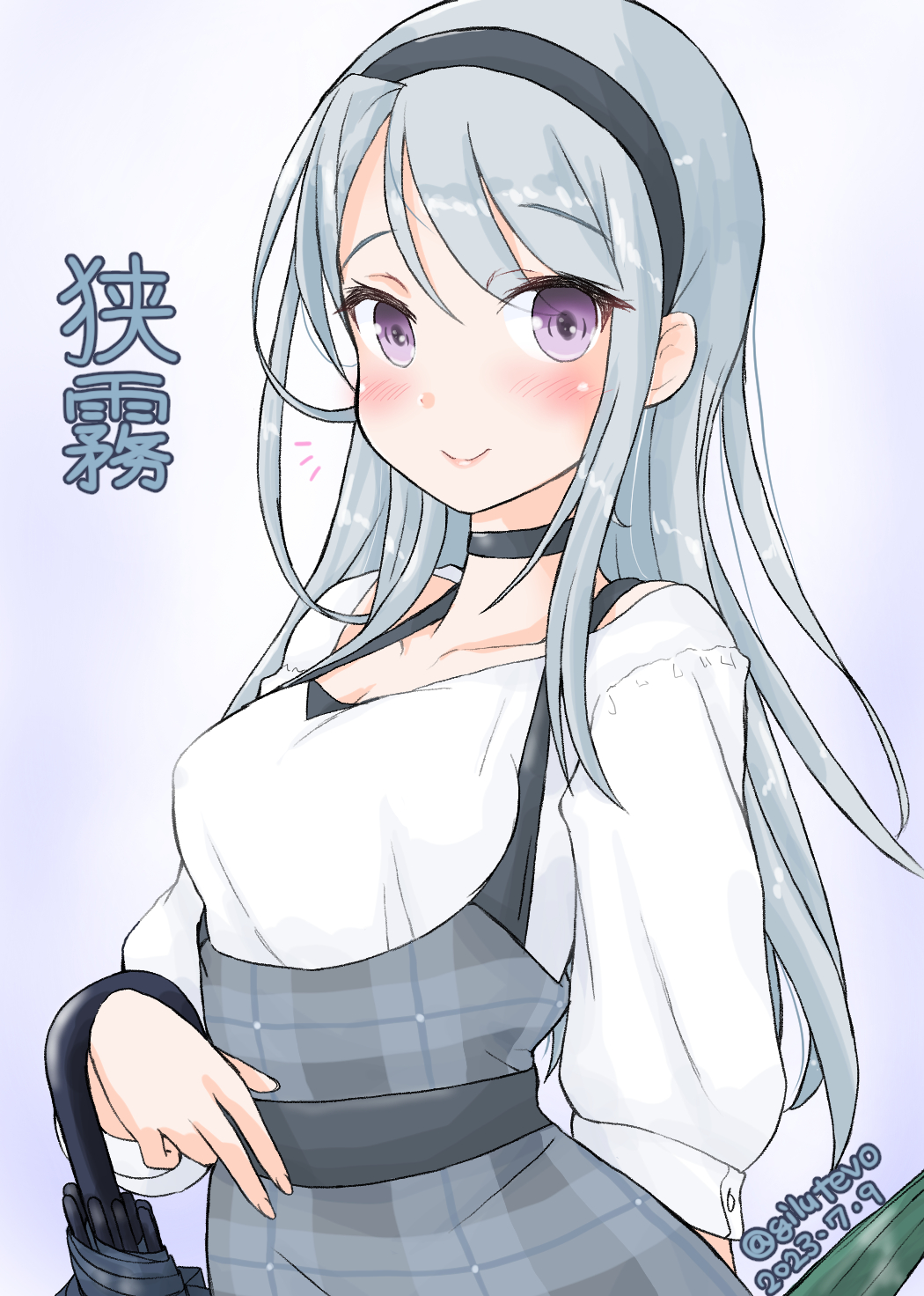 1girl asymmetrical_bangs black_choker black_hairband character_name choker collared_shirt commentary_request dated dress_shirt grey_hair grey_skirt hairband highres jack_(slaintheva) kantai_collection long_hair official_alternate_costume one-hour_drawing_challenge plaid_clothes plaid_skirt purple_eyes sagiri_(kancolle) sagiri_(rainy_season)_(kancolle) shirt skirt solo swept_bangs twitter_username umbrella upper_body white_shirt