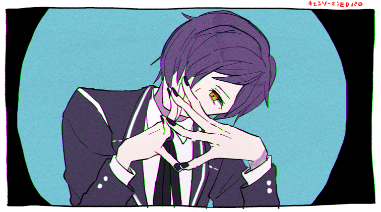 1boy ascot chainsaw_man coat collared_shirt hair_over_one_eye head_tilt jouzai_(tooboe) library_of_ruina long_sleeves looking_at_viewer project_moon purple_ascot purple_coat purple_hair purple_nails shirt solo steepled_fingers upper_body white_shirt wing_collar yellow_eyes yesod_(project_moon) yono_neie