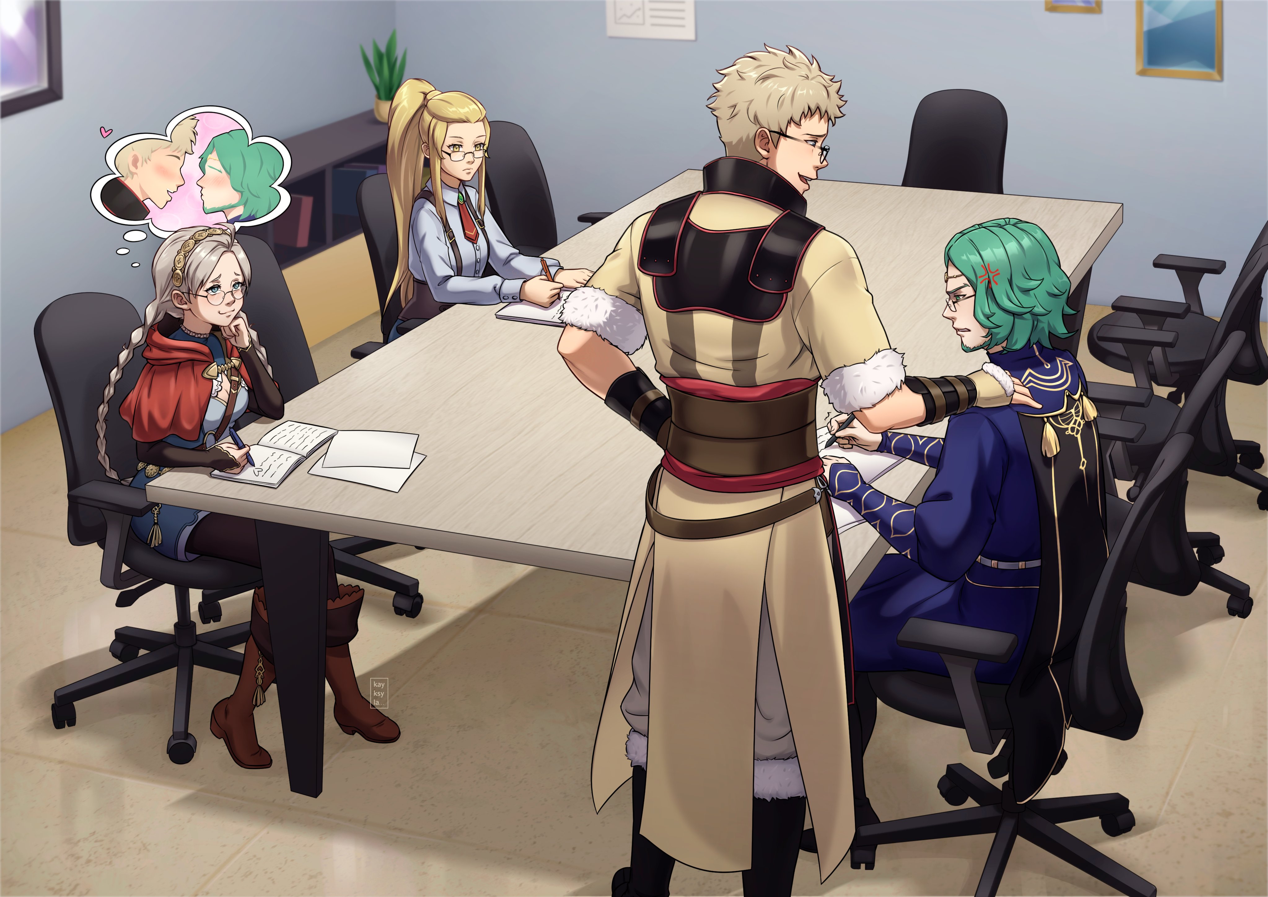 2boys 2girls absurdres ahoge anachronism anger_vein angry beard black_pants blonde_hair blue_eyes boots braid chair commission facial_hair fire_emblem fire_emblem:_three_houses fire_emblem_awakening fire_emblem_engage fire_emblem_fates fire_emblem_heroes fujoshi glasses green_hair grey_hair hairband heart high_ponytail highres jade_(fire_emblem) kayksyla leather leather_boots long_hair looking_at_another low_twin_braids multiple_boys multiple_girls nina_(fire_emblem) nintendo office_chair owain_(fire_emblem) pants parted_bangs ponytail second-party_source seteth_(fire_emblem) shipping_(fandom) swivel_chair twin_braids writing yellow_eyes