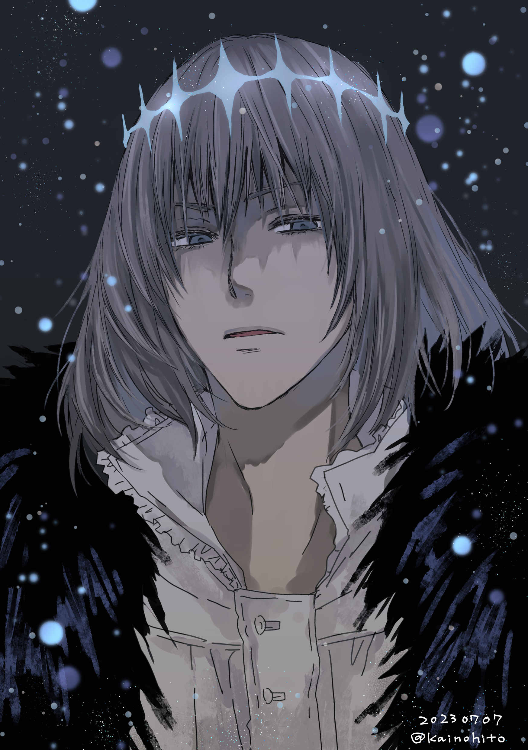 1boy absurdres artist_name blue_eyes cape collared_shirt crown dated diamond_hairband fate/grand_order fate_(series) fur-trimmed_cape fur_trim grey_hair highres kainohito looking_at_viewer male_focus medium_hair oberon_(fate) oberon_(third_ascension)_(fate) shirt solo upper_body white_shirt