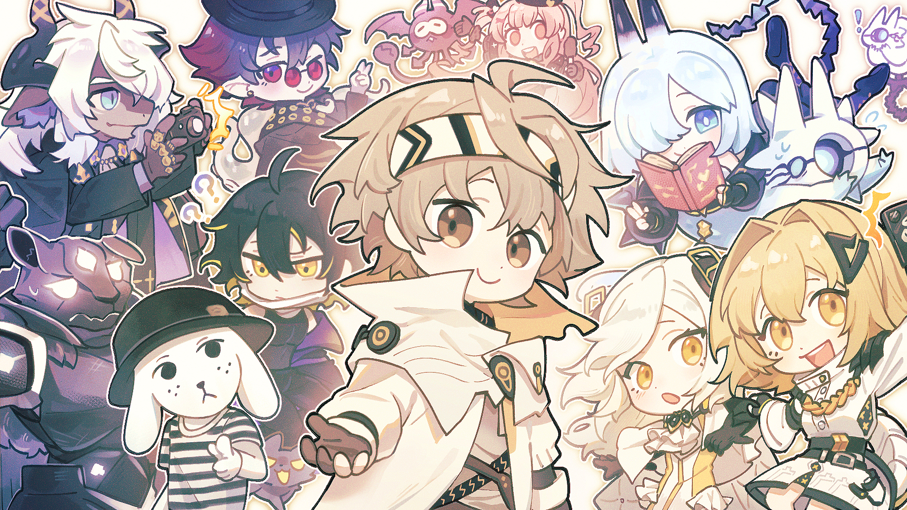 ! ? alchemy_stars bethel_(alchemy_stars) book camera carleen_(alchemy_stars) chibi hair_ornament headband highres holding holding_book holding_camera hydrad_(alchemy_stars) istvan_(alchemy_stars) jl_seiko kleken_(alchemy_stars) lilica_(alchemy_stars) navigator_(alchemy_stars) seleucid_(alchemy_stars) smile tourdog_(character) vice_(alchemy_stars)