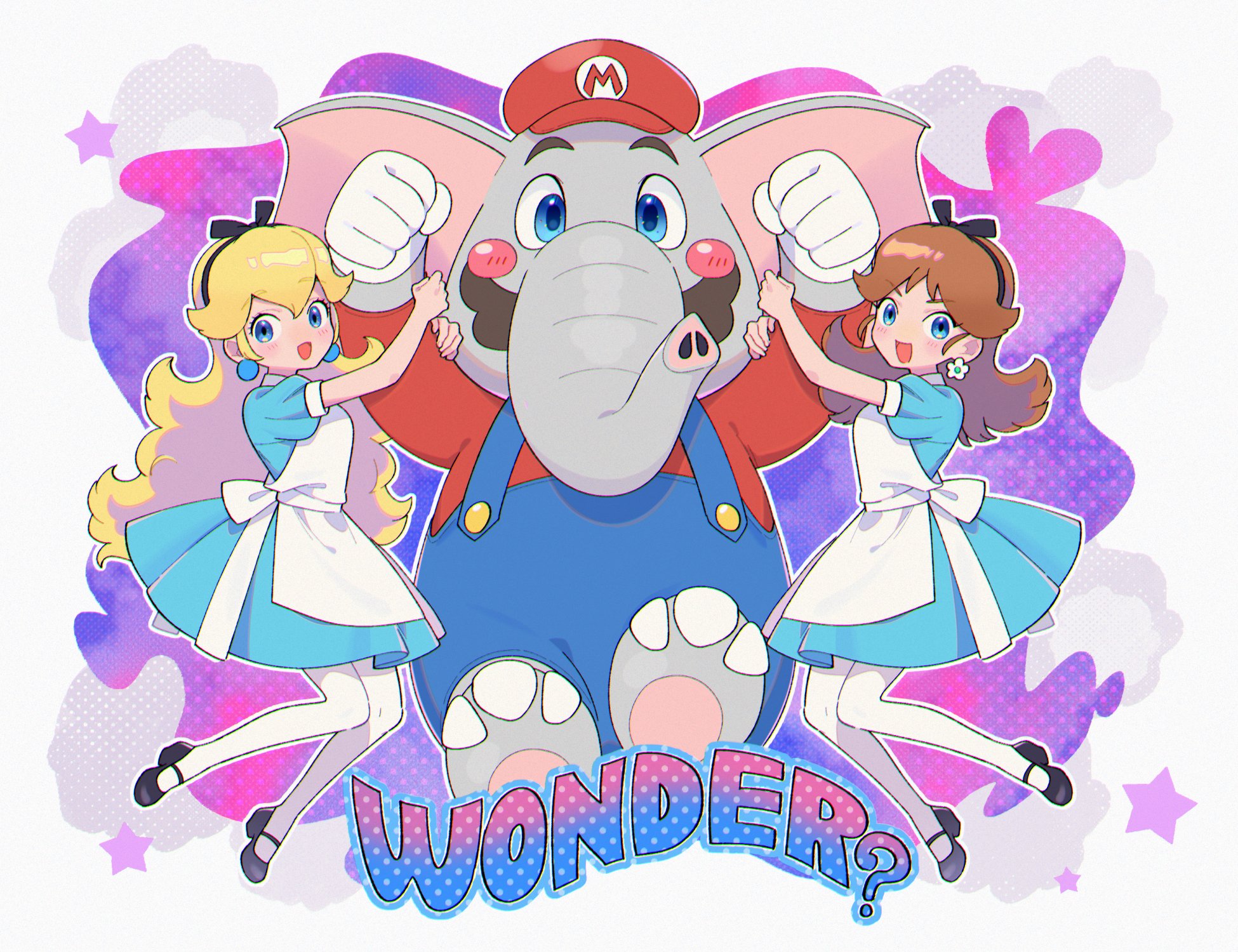 1boy 2girls alice_(alice_in_wonderland)_(cosplay) alice's_adventures_in_wonderland animal_ears blonde_hair blue_eyes breasts brown_hair cosplay dress earrings elephant_ears elephant_mario facial_hair flower_earrings full_body gloves hat headband highres jewelry long_hair looking_at_viewer mario mario_(series) multiple_girls mustache nintendo overalls pantyhose power-up princess_daisy princess_peach riomario small_breasts super_mario_bros._wonder title