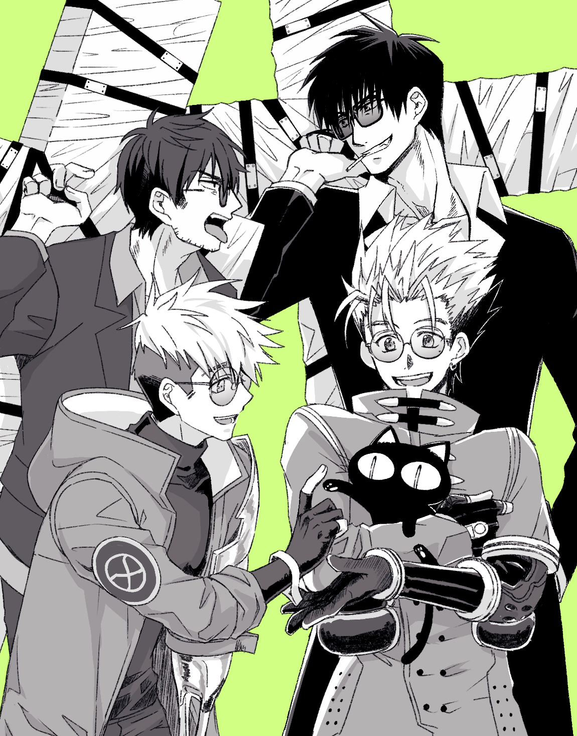 4boys animal arm_up beard_stubble cat cigarette collared_shirt cowboy_shot cross earrings facial_hair glasses gloves green_background greyscale_with_colored_background grin hand_in_pocket hand_up highres holding holding_animal holding_cross jacket jewelry kuroneko_(trigun) large_cross long_sleeves male_focus mole mole_under_eye mouth_hold multiple_boys nicholas_d._wolfwood open_mouth pants partially_fingerless_gloves profile round_eyewear shirt short_hair simple_background single_earring smile spiked_hair standing strap stubble teeth teeth_hold tinted_eyewear tongue tongue_out trigun trigun_stampede undercut v-shaped_eyebrows vash_the_stampede ysm_rkgk