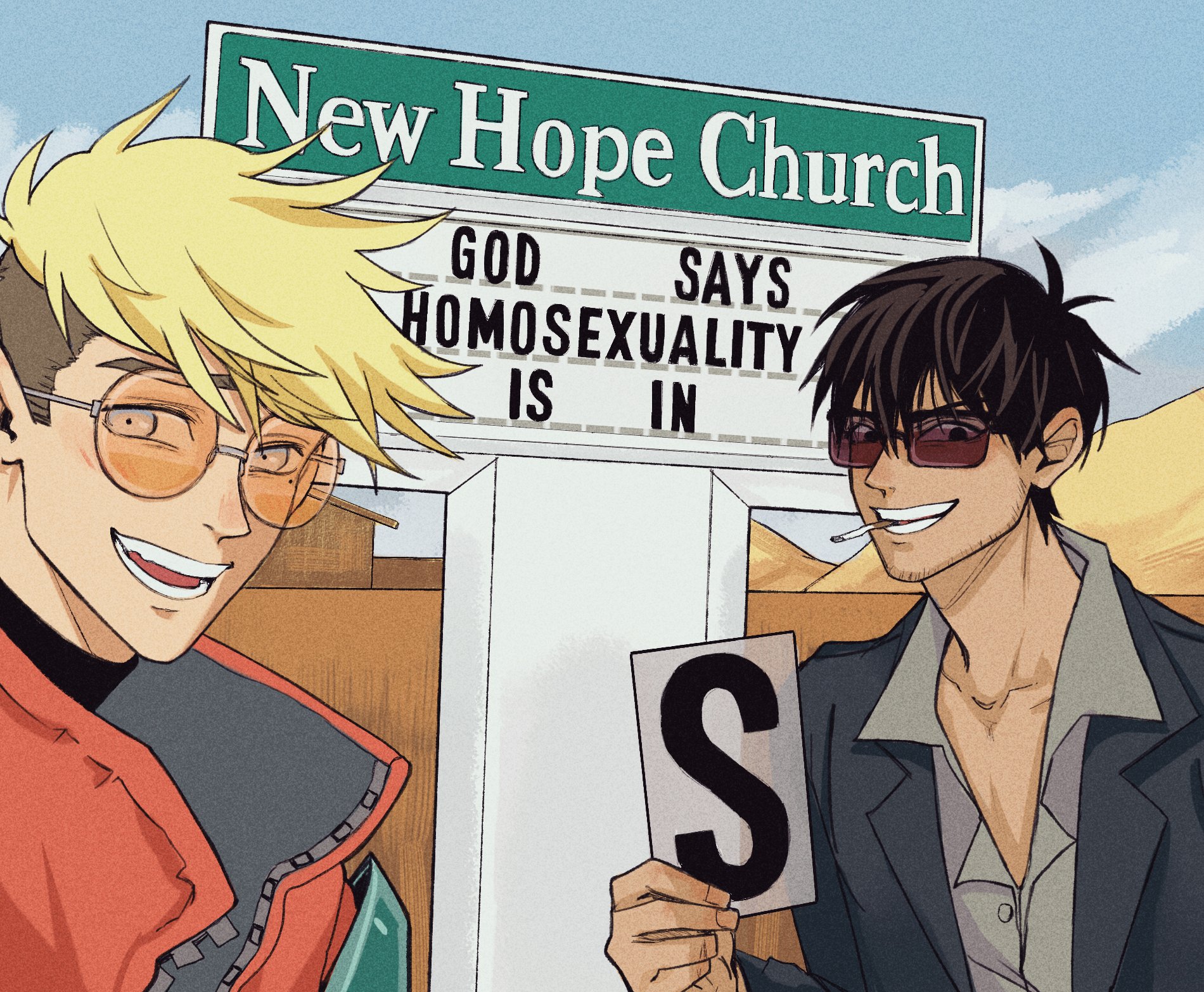 2boys black_hair black_jacket blonde_hair cigarette collarbone collared_shirt commentary day english_commentary english_text florbetriz grey_shirt hand_up highres holding jacket long_sleeves looking_at_viewer male_focus mole mole_under_eye mouth_hold multiple_boys nicholas_d._wolfwood open_mouth outdoors red_jacket shirt short_hair sign smile sunglasses teeth teeth_hold trigun trigun_stampede undercut upper_body vash_the_stampede