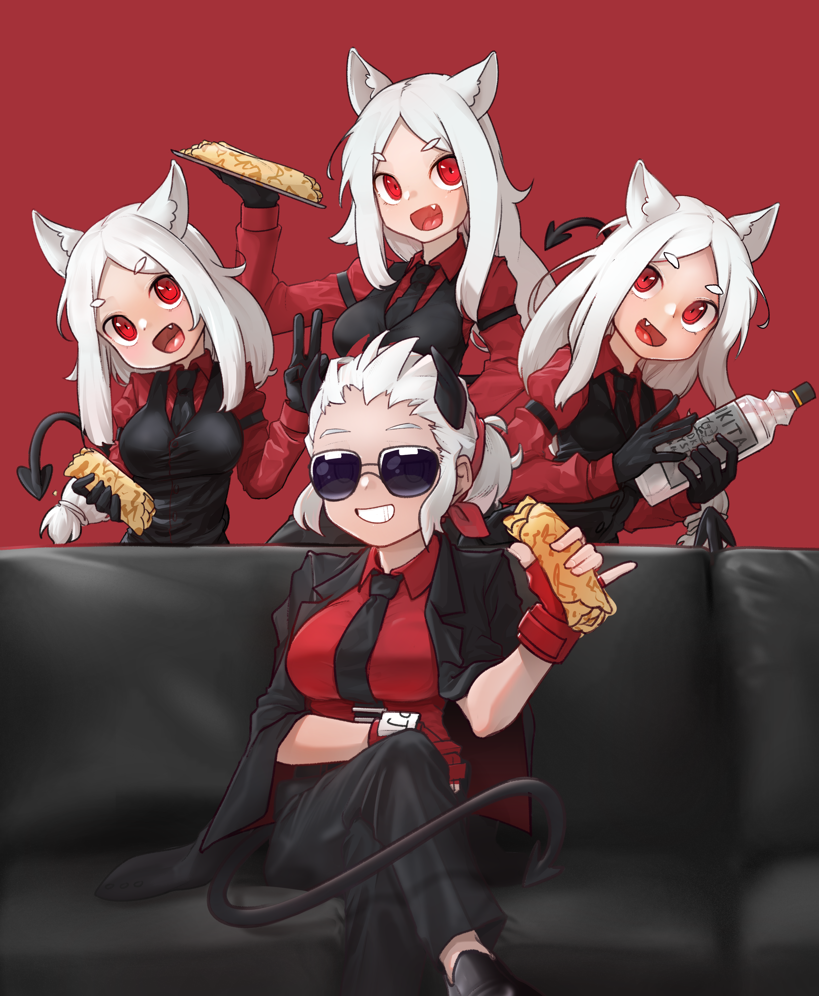4girls :d absurdres alcohol animal_ears armband black_armband black_footwear black_gloves black_horns black_jacket black_necktie black_pants black_tail black_vest blind bottle breasts cerberus_(helltaker) commentary_request couch crossed_legs demon_girl demon_horns demon_tail dog_ears dog_girl dress_shirt fang feet_out_of_frame fingerless_gloves food gloves grin hair_slicked_back helltaker highres holding holding_bottle holding_food holding_plate horns jacket jacket_on_shoulders justice_(helltaker) korean_commentary large_breasts long_hair looking_at_viewer medium_breasts multiple_girls necktie on_couch open_mouth pancake pants parted_bangs pinky_out plate ponytail red_background red_eyes red_gloves red_shirt shirt shoes short_eyebrows sidelocks simple_background sitting smile standing suit_jacket sunglasses tail triplets v vest vodka white_hair wweed