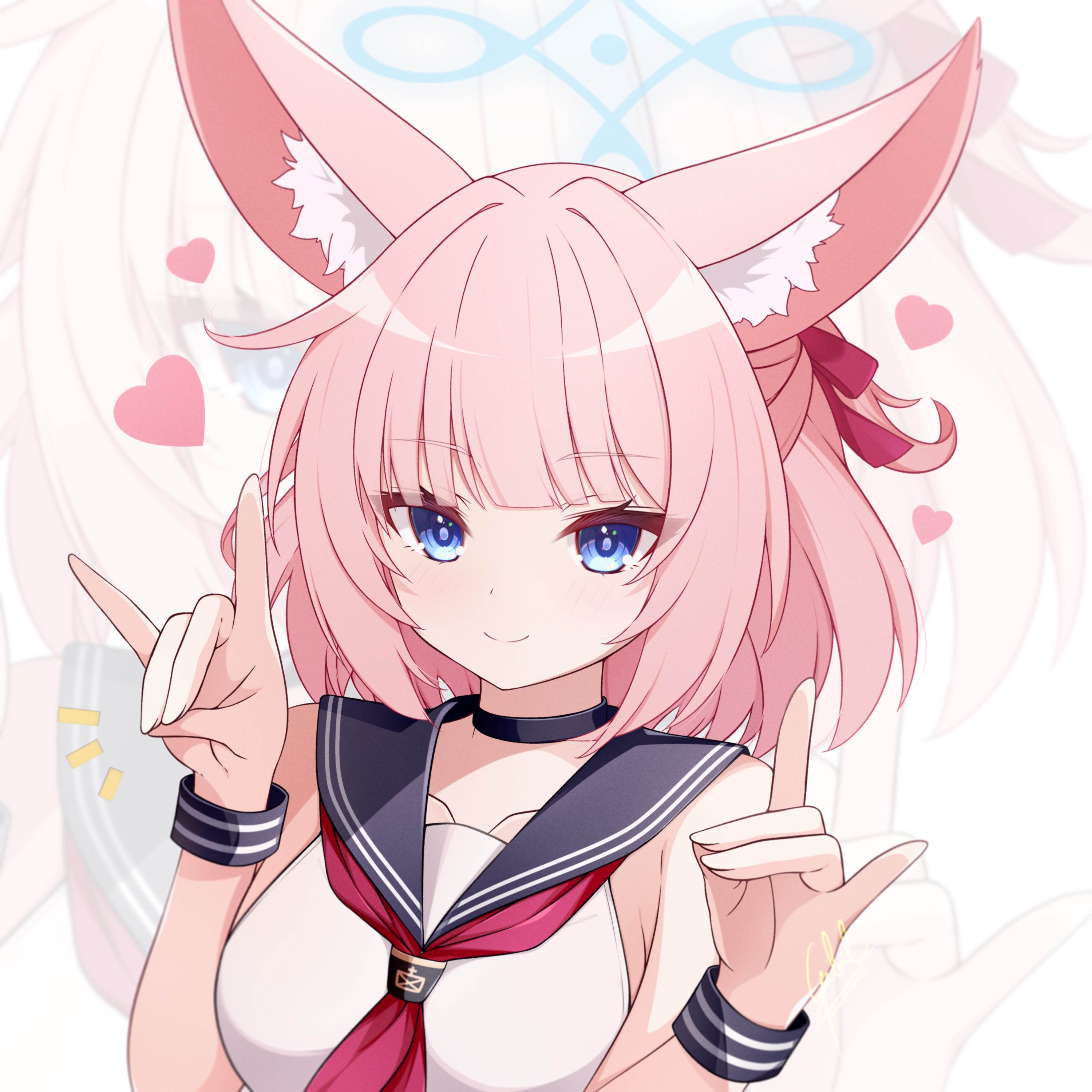 1girl absurdres animal_ears blue_archive blue_eyes blush breasts choker double_fox_shadow_puppet fox_ears fox_shadow_puppet gabriel_evangel hair_ribbon heart highres looking_at_viewer medium_breasts niko_(blue_archive) pink_hair ribbon sailor_collar school_uniform serafuku short_hair sleeveless smile solo