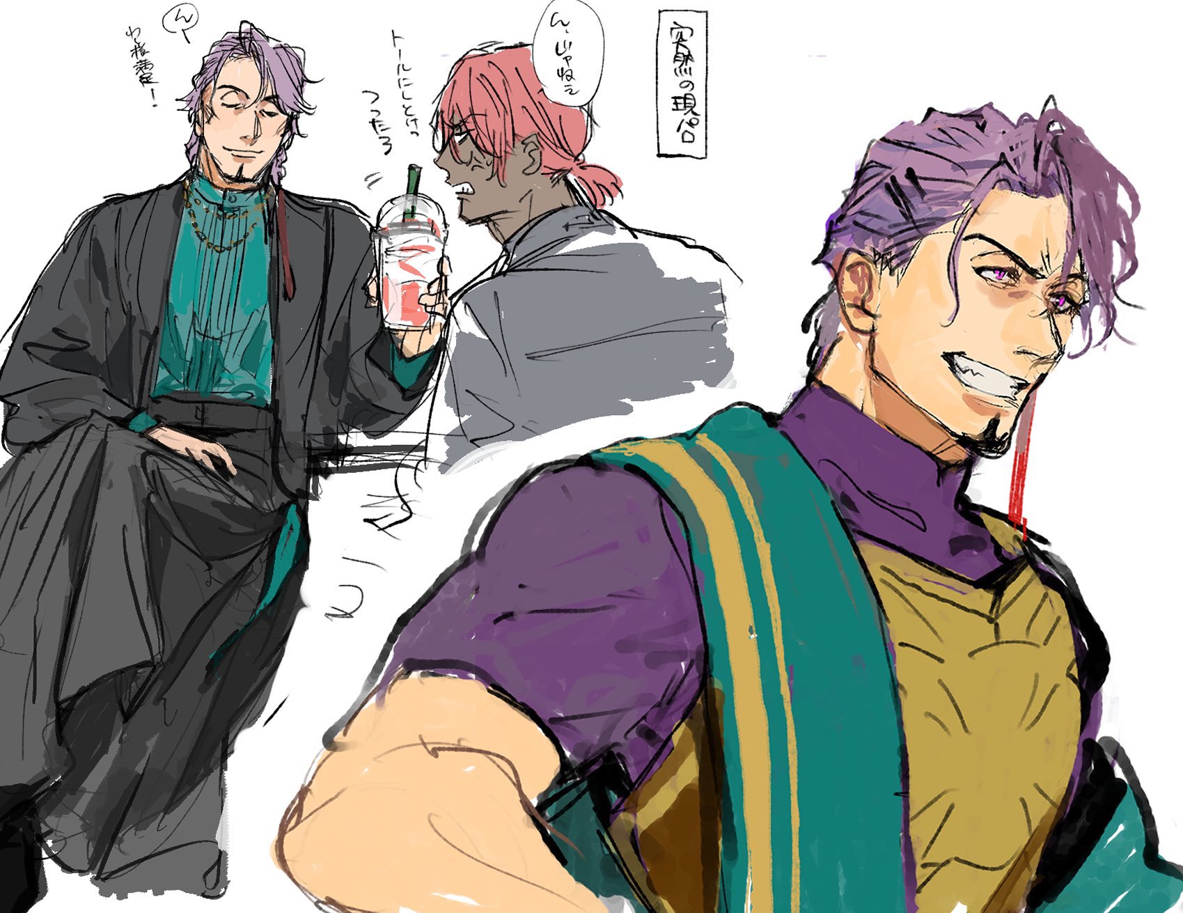 2boys alternate_costume armor ashwatthama_(fate) black_shirt breastplate bubble_tea collage collared_shirt cup dark-skinned_male dark_skin disposable_cup drinking_straw duryodhana_(fate) duryodhana_(second_ascension)_(fate) earrings facial_hair fate/grand_order fate_(series) goatee goatee_stubble highres holding holding_cup jewelry male_focus margot_431 mature_male multiple_boys necklace open_clothes open_shirt profile purple_eyes purple_hair red_hair sash shirt short_hair shoulder_sash simple_background single_earring smile stubble translation_request upper_body white_background