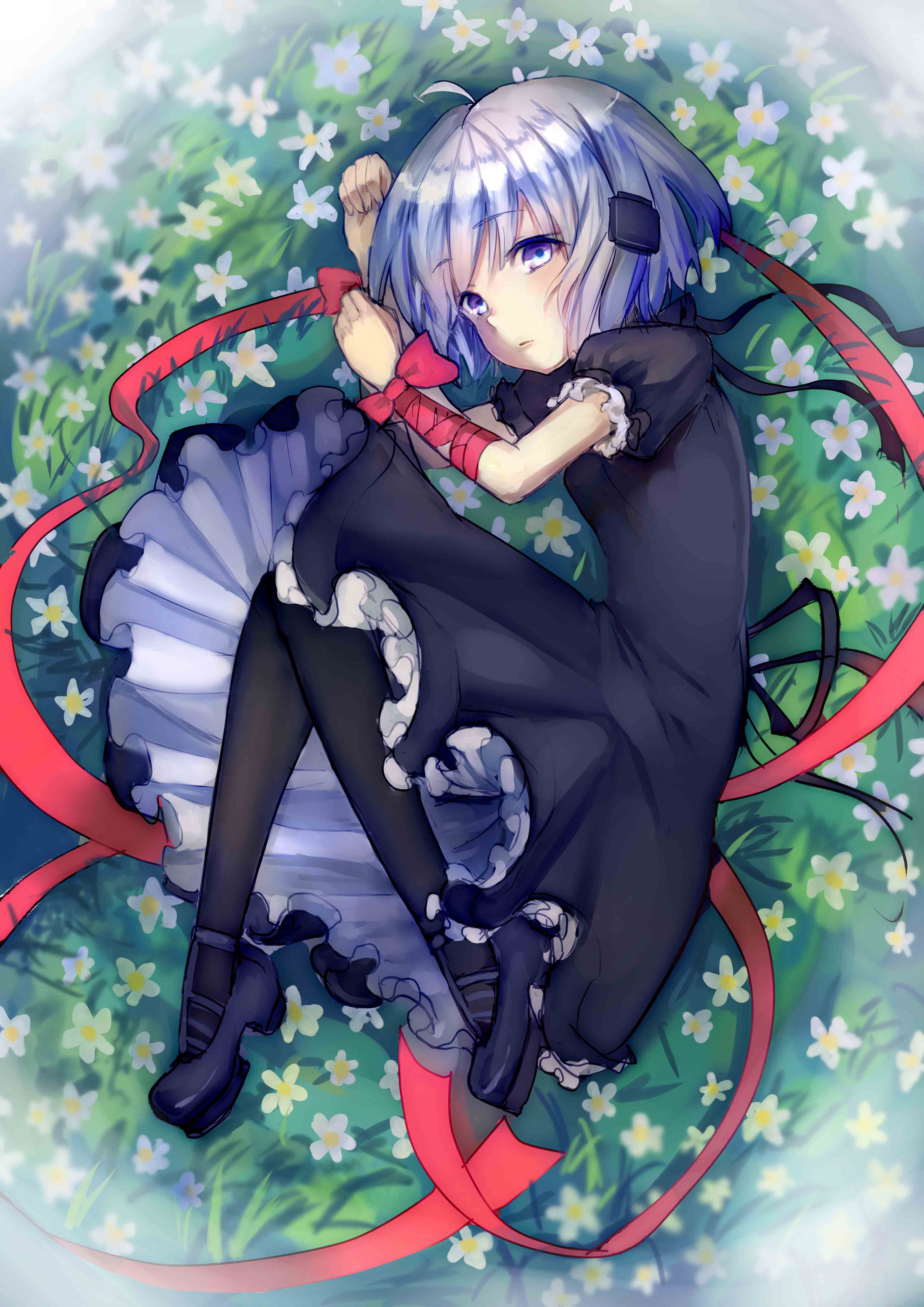 1girl absurdres ahoge arm_ribbon black_dress black_footwear black_pantyhose black_ribbon blurry_edges clenched_hands closed_mouth commentary dress expressionless flower frilled_dress frilled_sleeves frills full_body grass grey_hair hair_between_eyes highres ice_(icepuli) kagari_(rewrite) knees_together_feet_apart long_ribbon looking_at_viewer lying mary_janes on_ground on_side outdoors pantyhose puffy_short_sleeves puffy_sleeves purple_eyes red_ribbon rewrite ribbon shoes short_hair short_sleeves white_flower wrist_bow