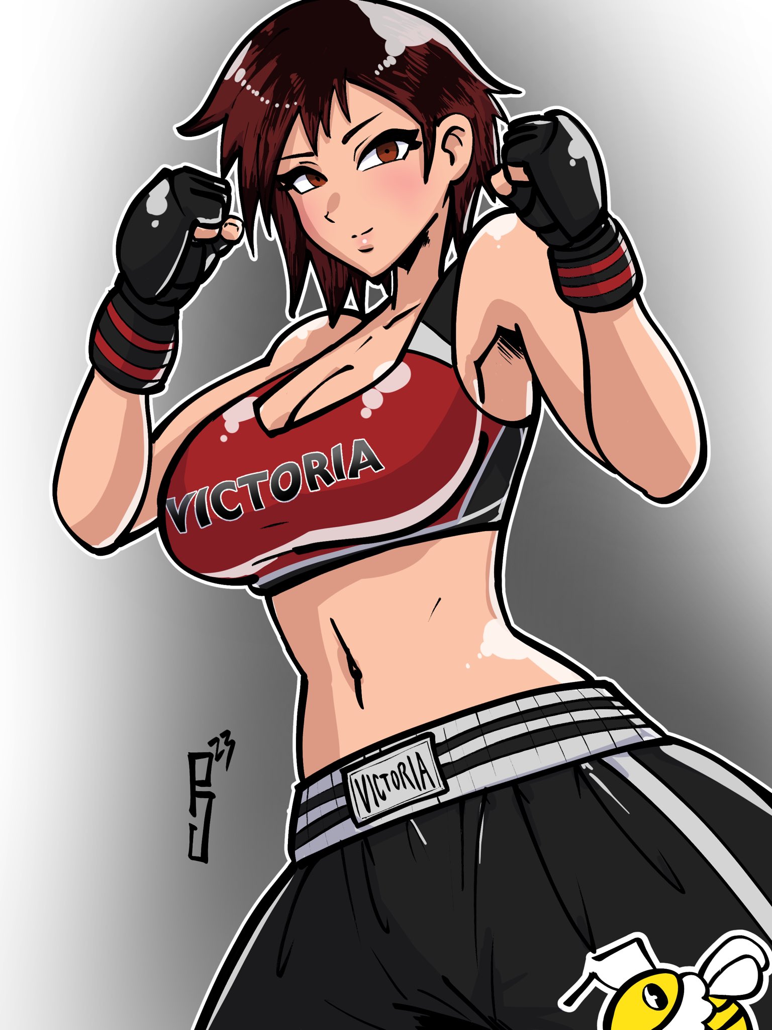 1girl bare_shoulders breasts crop_top dead_or_alive fighting_stance fingerless_gloves gloves highres large_breasts mila_(doa) paddy_g_(terrybrogard) red_hair short_hair shorts sleeveless
