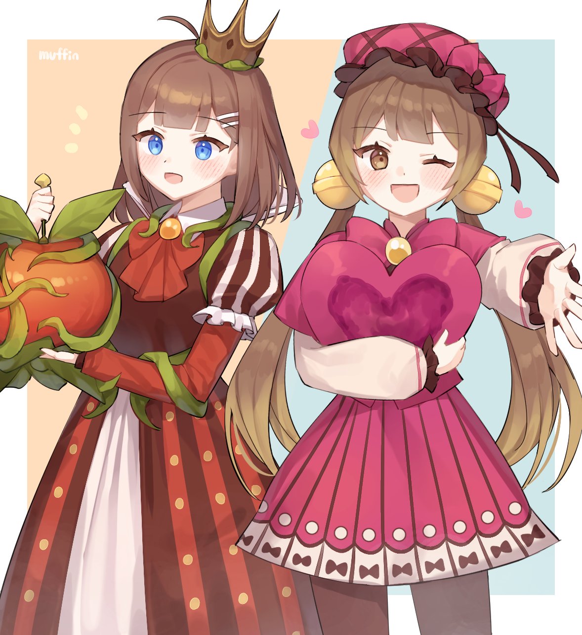 2girls ahoge apple bell blue_eyes blush bow bowtie brooch brown_eyes brown_hair crown dress e.g.o_(project_moon) food frilled_headwear frilled_sleeves frills fruit green_stem_(e.g.o) hair_bell hair_ornament hairclip hat heart highres hod_(project_moon) holding holding_food holding_fruit holding_heart jewelry jingle_bell juliet_sleeves laetitia_(e.g.o) library_of_ruina long_hair long_sleeves love_mintchoco low_twintails malkuth_(project_moon) medium_hair mob_cap multiple_girls one_eye_closed open_mouth pantyhose pink_bow pink_bowtie pink_dress pink_headwear plant project_moon puffy_sleeves red_bow red_bowtie red_dress twintails very_long_hair vines