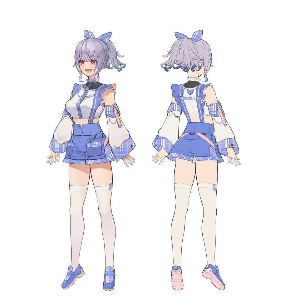 1girl artist_request breasts collar crop_top detached_sleeves frilled_collar frills full_body gradient_hair grey_hair hair_ribbon loafers medium_breasts multicolored_hair multiple_views official_alternate_costume official_art open_mouth phantasy_star phantasy_star_online_2 phantasy_star_online_2_new_genesis pink_eyes ponytail popona ribbon shoes shorts smile suspenders thighhighs turnaround