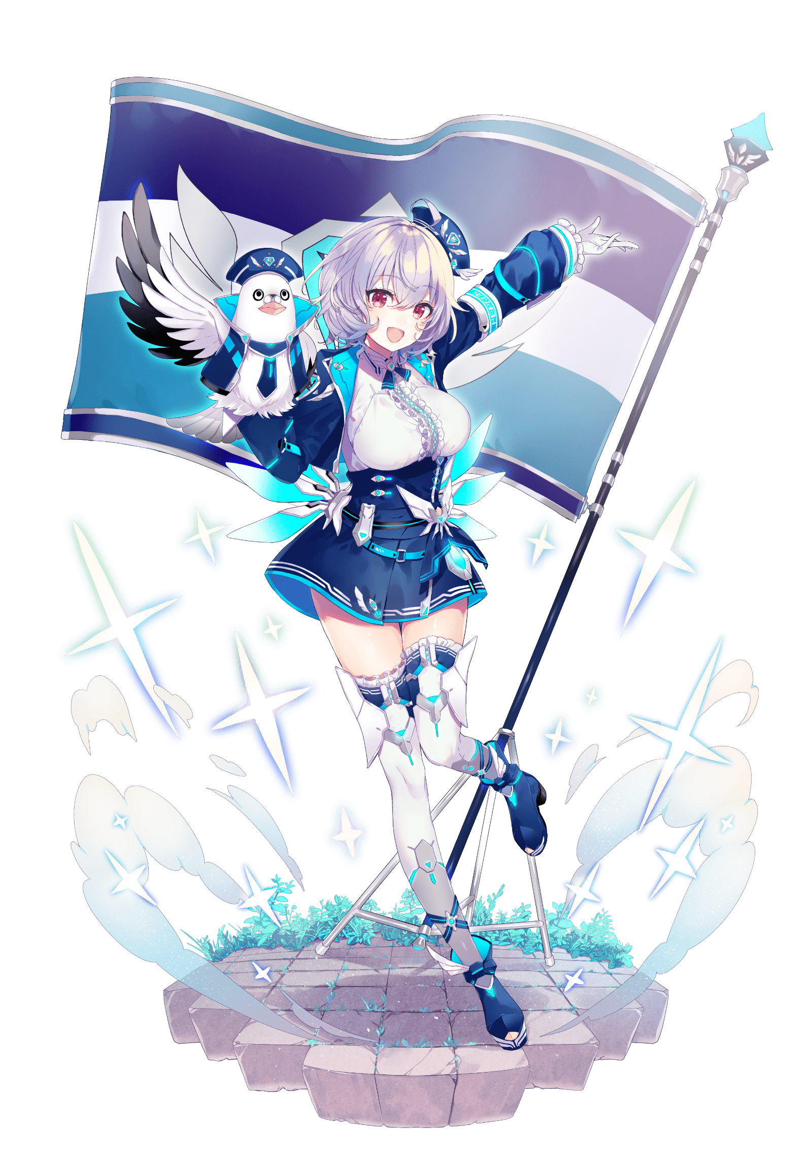 1girl ahoge artist_request beret breasts frills full_body grey_hair hand_puppet hat highres large_breasts official_art phantasy_star phantasy_star_online_2 phantasy_star_online_2_new_genesis pink_eyes popona puppet second-party_source short_hair solo thighhighs transparent_background zettai_ryouiki
