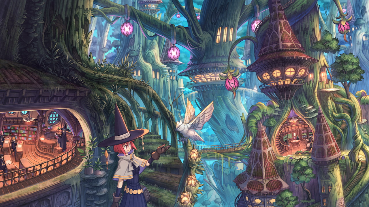 3girls 6+others belt belt_pouch bird black_dress bookshelf brown_gloves building capelet classroom dress forest giant_tree gloves hat moss multiple_girls multiple_others nagi_itsuki nature owl plant pouch red_hair short_hair standing tree treehouse vines virtual_market white_bird white_capelet wide_shot witch_hat
