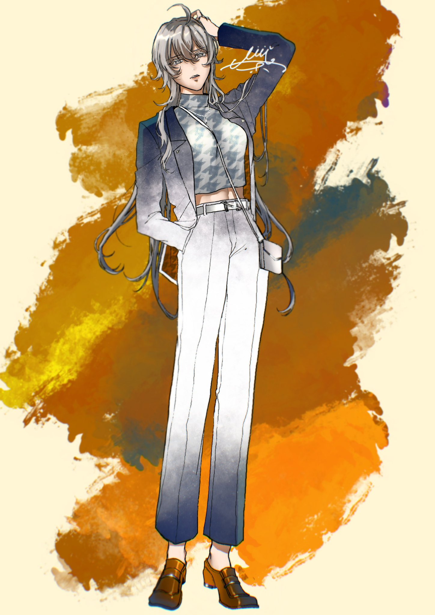 1girl alternate_costume bag belt between_breasts breasts crop_top full_body grey_eyes grey_hair hair_between_eyes hand_in_pocket hand_on_own_head highres jacket jewelry kantai_collection long_hair medium_breasts necklace open_clothes open_jacket oucha_(aupt31) pants parted_lips shoes signature simple_background solo standing strap_between_breasts turtleneck washington_(kancolle)