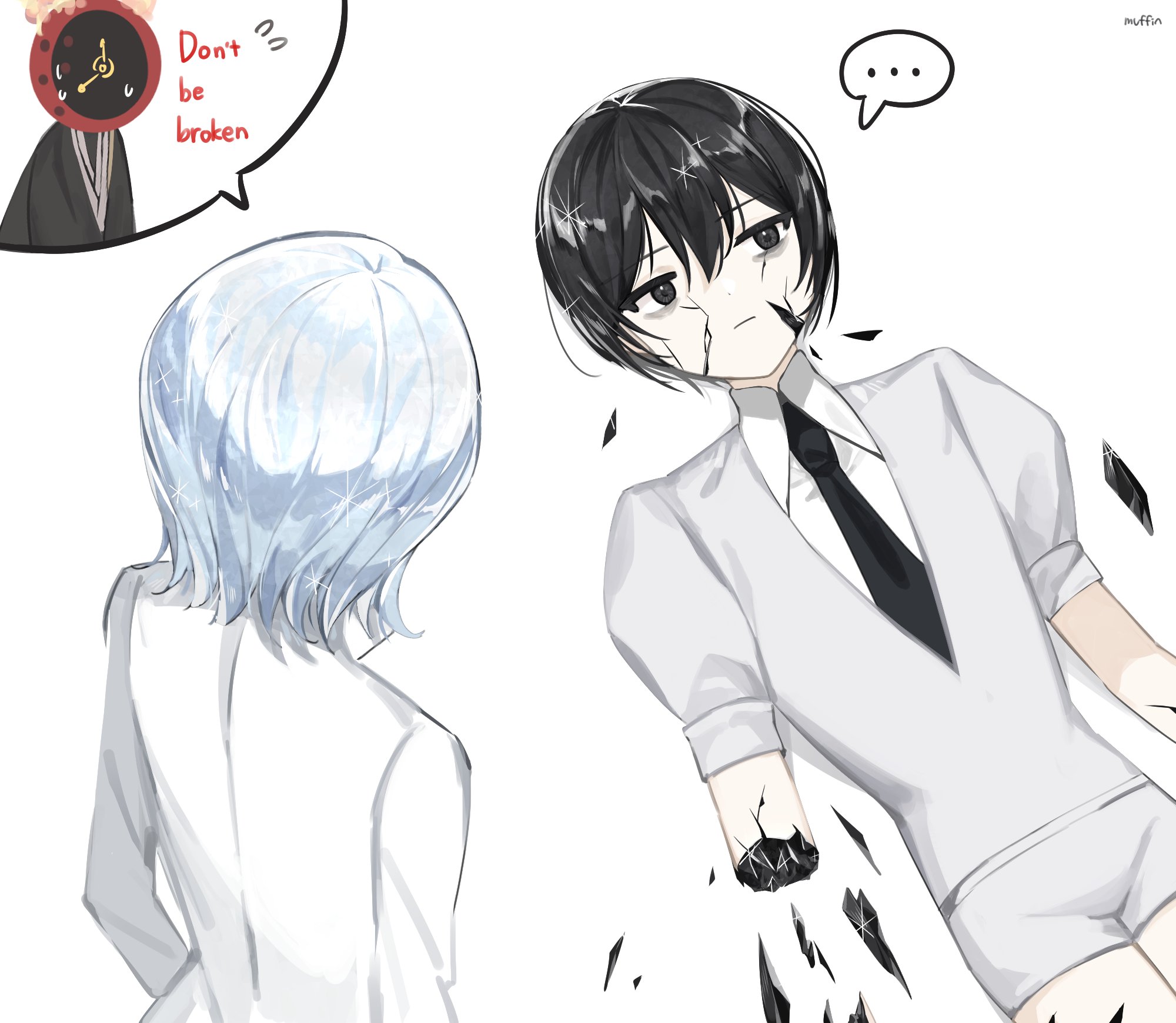 1boy 1girl 1other black_eyes black_gem black_hair black_necktie broken_arm collared_shirt cracked_skin crossover crystal_hair dante_(limbus_company) faust_(project_moon) gem gem_uniform_(houseki_no_kuni) highres houseki_no_kuni jacket lab_coat limbus_company love_mintchoco necktie project_moon puffy_short_sleeves puffy_sleeves shirt short_sleeves shorts simple_background sparkle white_background white_hair white_jacket white_shirt white_shorts yi_sang_(project_moon)
