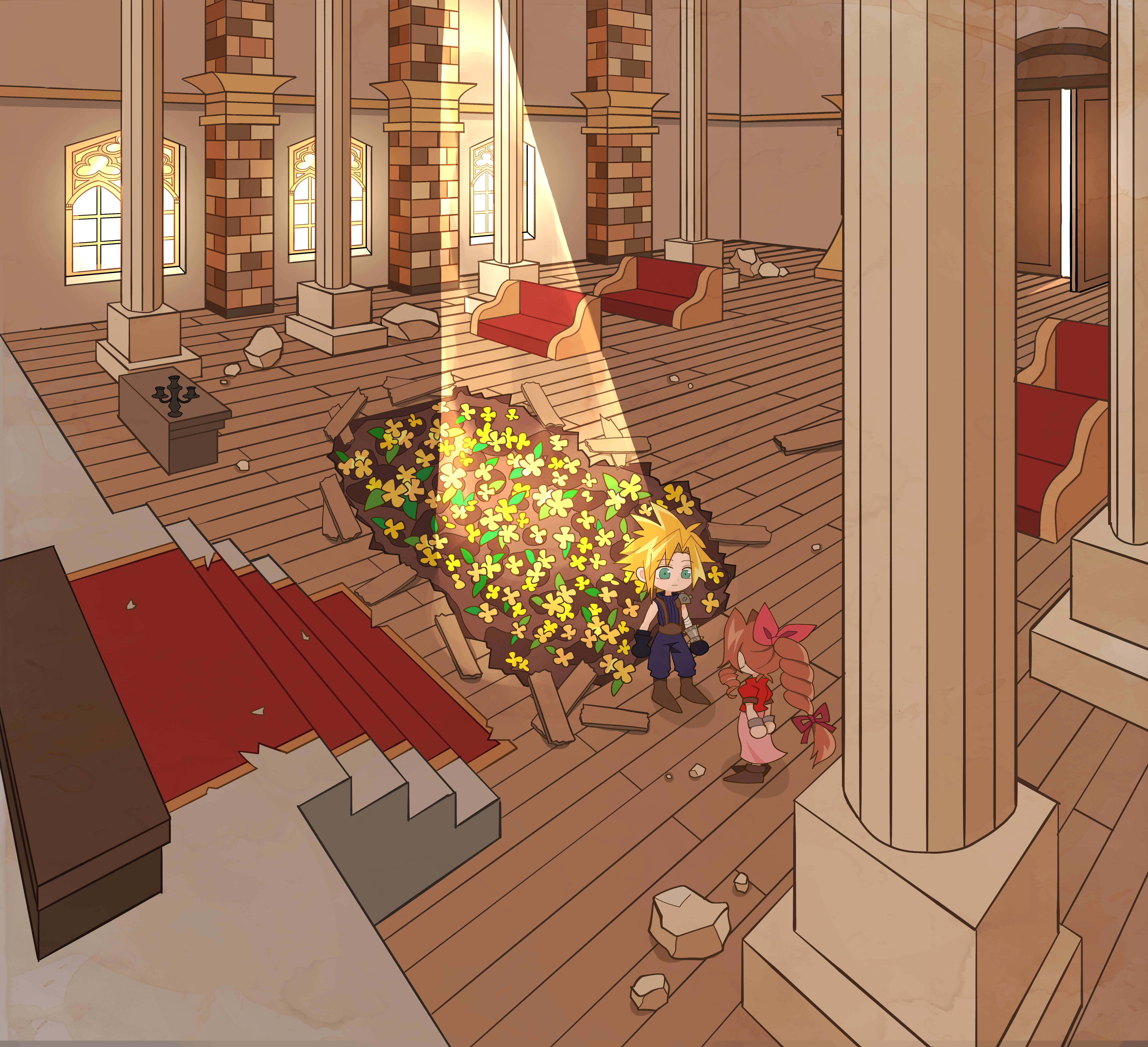 1boy 1girl absurdres aerith_gainsborough altar armor arms_behind_back asymmetrical_arms belt black_gloves blonde_hair boots bracelet brick brown_footwear brown_hair chibi church cloud_strife day door dress expressionless facing_away final_fantasy final_fantasy_vii flower gloves green_eyes hair_ribbon highres interior jacket jewelry large_belt leather_belt light_rays long_hair open_door pants pauldrons pew pink_dress pink_ribbon red_jacket ribbon scenery short_hair shoulder_armor single_pauldron sleeveless sleeveless_turtleneck spiked_hair stairs standing sunbeam sunlight suspenders ttnoooo turtleneck wooden_floor yellow_flower