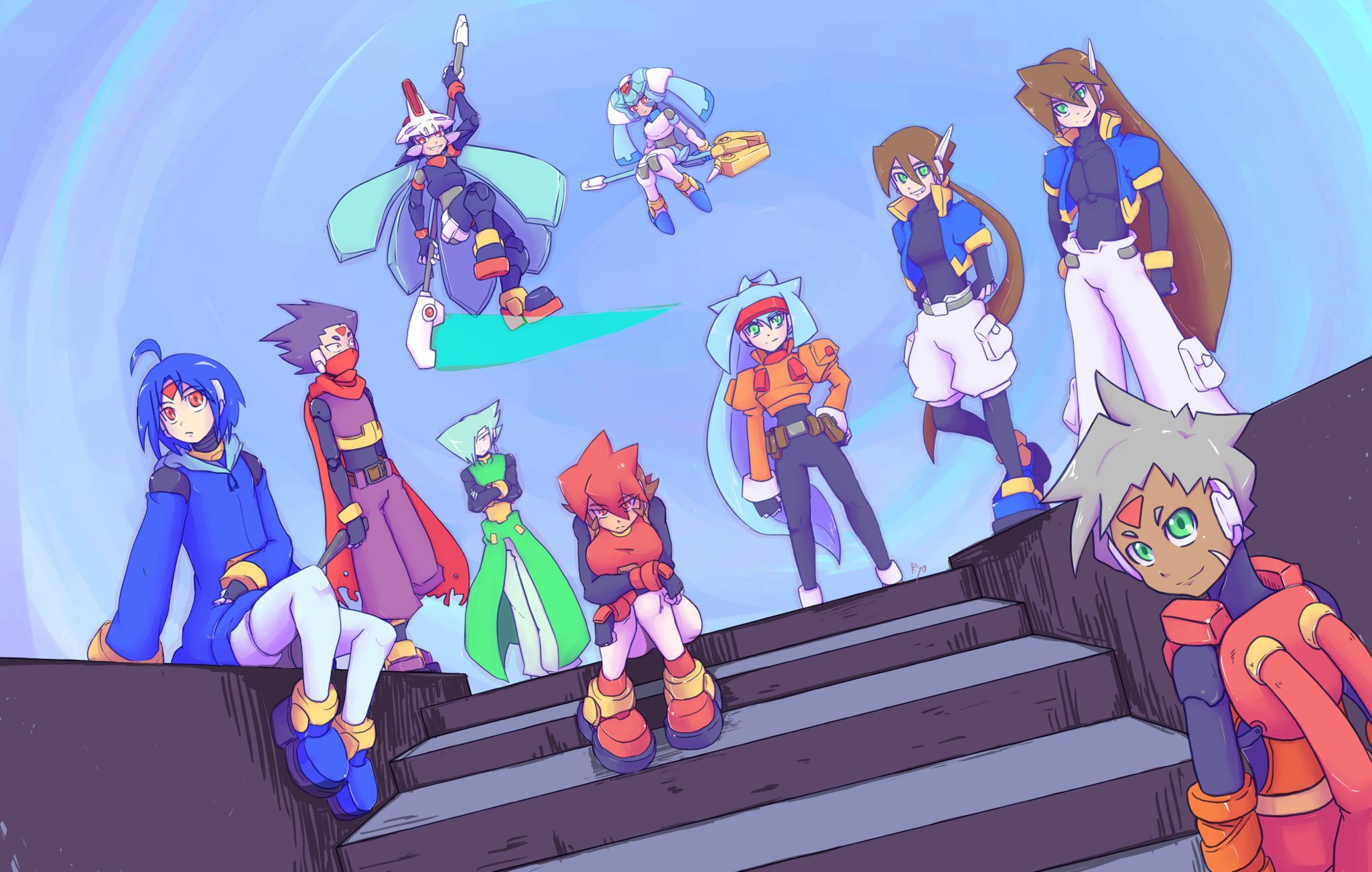 4girls 6+boys aeolus_(mega_man) aile_(mega_man_zx) ashe_(mega_man) atlas_(mega_man) blue_hair brown_hair crop_top cropped_jacket energy_blade facial_mark forehead_mark green_eyes grey_(mega_man) grey_hair helmet high_ponytail highres light_blue_hair light_green_hair long_hair mask mega_man_(series) mega_man_zx mega_man_zx_advent mouth_mask multiple_boys multiple_girls ninja_mask orange_hair pandora_(mega_man) ponytail prometheus_(mega_man) purple_hair red_eyes scythe short_hair siarnaq_(mega_man) tagme thetis_(mega_man) vent_(mega_man)