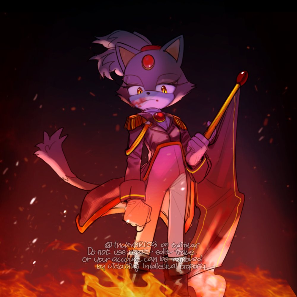1girl animal_ears animal_nose artist_name black_background black_boots blaze_the_cat blood blood_on_face boots cat_ears cat_girl cat_tail closed_mouth coat collared_coat collared_shirt eyelashes fire flag forehead_jewel furry furry_female gem gloves gradient_background half-closed_eyes hand_up holding holding_flag long_sleeves looking_at_viewer open_clothes open_coat pants purple_coat purple_fur purple_shirt red_background red_gem shirt solo sonic_(series) standing sucho tail topknot watermark white_gloves white_pants yellow_eyes