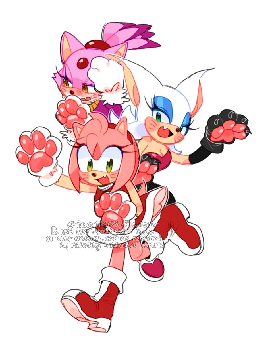 3girls amy_rose animal_ears animal_hands animal_nose artist_name bare_shoulders bat_ears bat_girl black_bodysuit blaze_the_cat blue_eyeshadow blush bodysuit boots breasts cat_ears cat_girl dress eyelashes eyeshadow fang forehead_jewel furry furry_female gem green_eyes hairband half-closed_eyes hands_up heart hedgehog_girl high_heels highres jacket leg_up long_sleeves looking_at_viewer looking_to_the_side makeup medium_breasts multicolored_footwear multiple_girls open_mouth orange_eyes pink_fur purple_fur purple_jacket red_dress red_footwear red_gem red_hairband rouge_the_bat short_tail simple_background sleeveless sleeveless_dress smile sonic_(series) standing standing_on_one_leg sucho sweat tail tongue topknot watermark white_background white_footwear white_fur