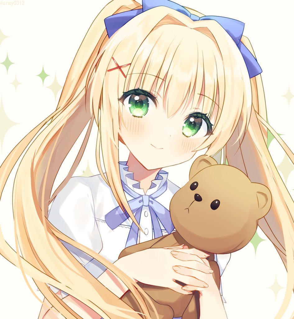 1girl aiyan blonde_hair blue_bow blue_ribbon blush bow closed_mouth collar colored_eyelashes commentary_request eyelashes eyes_visible_through_hair fingernails floating_hair frilled_collar frills green_eyes hair_between_eyes hair_bow hair_intakes hair_ornament hands_up holding holding_stuffed_toy interlocked_fingers long_hair looking_at_viewer own_hands_together puffy_short_sleeves puffy_sleeves ribbon shirt short_sleeves simple_background smile solo sparkle straight_hair stuffed_animal stuffed_toy summer_pockets teddy_bear tsumugi_wenders twintails upper_body very_long_hair white_background white_shirt x_hair_ornament