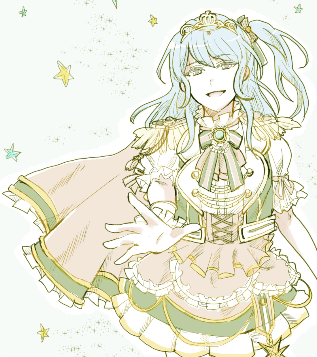 1girl ayutarochan bang_dream! bang_dream!_girls_band_party! blue_hair bow bowtie brooch commentary cowboy_shot frilled_sleeves frills highres idol idol_clothes jewelry long_hair matsubara_kanon one_side_up open_mouth puffy_short_sleeves puffy_sleeves reaching reaching_towards_viewer short_sleeves sidelocks simple_background smile solo tiara white_background