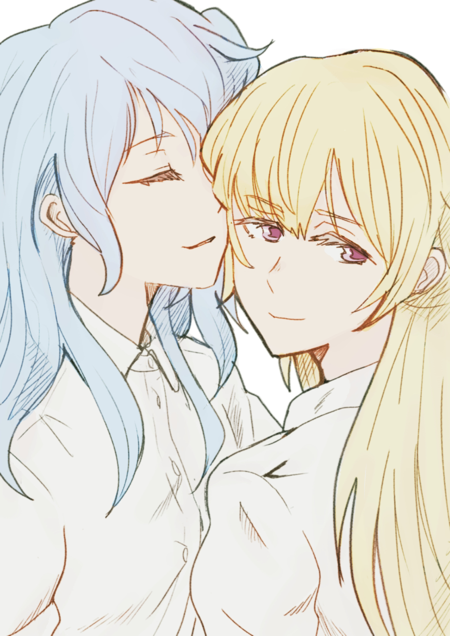 2girls ayutarochan bang_dream! bang_dream!_girls_band_party! blonde_hair blue_hair closed_eyes closed_mouth collared_shirt commentary dress_shirt highres long_hair matsubara_kanon multiple_girls parted_lips purple_eyes shirasagi_chisato shirt sidelocks simple_background upper_body white_background white_shirt yuri