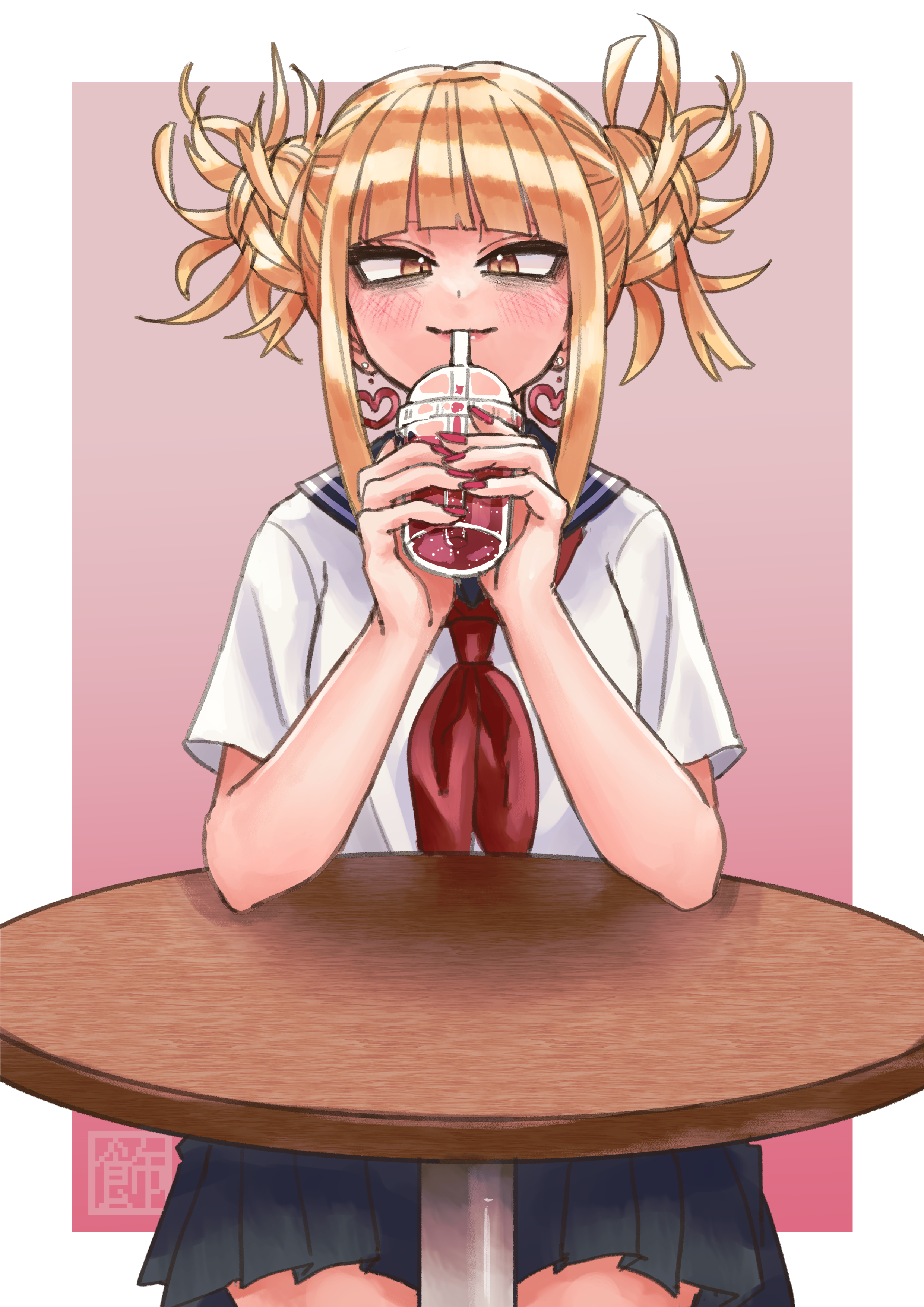 1girl absurdres blonde_hair blue_skirt blunt_bangs blush boku_no_hero_academia brown_eyes double_bun drinking drinking_straw hair_bun highres kazari_kabocya messy_hair pleated_skirt school_uniform serafuku sidelocks skirt slit_pupils solo table toga_himiko