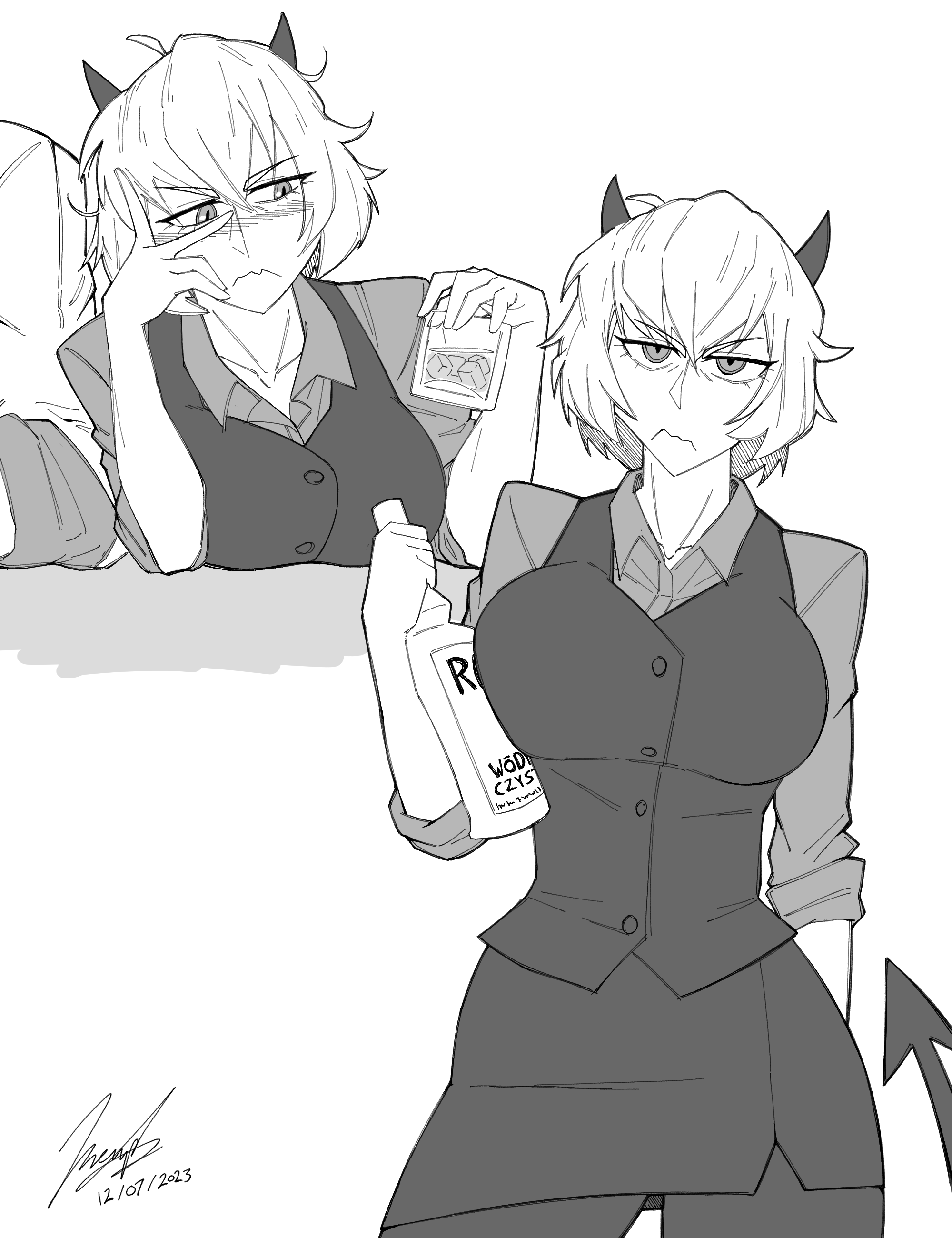 1boy 1girl absurdres alcohol annoyed bottle cup demon demon_girl demon_horns demon_tail helltaker helltaker_(character) highres holding holding_bottle holding_cup horns malina_(helltaker) shirt tail vest vodka zhentaisenpai