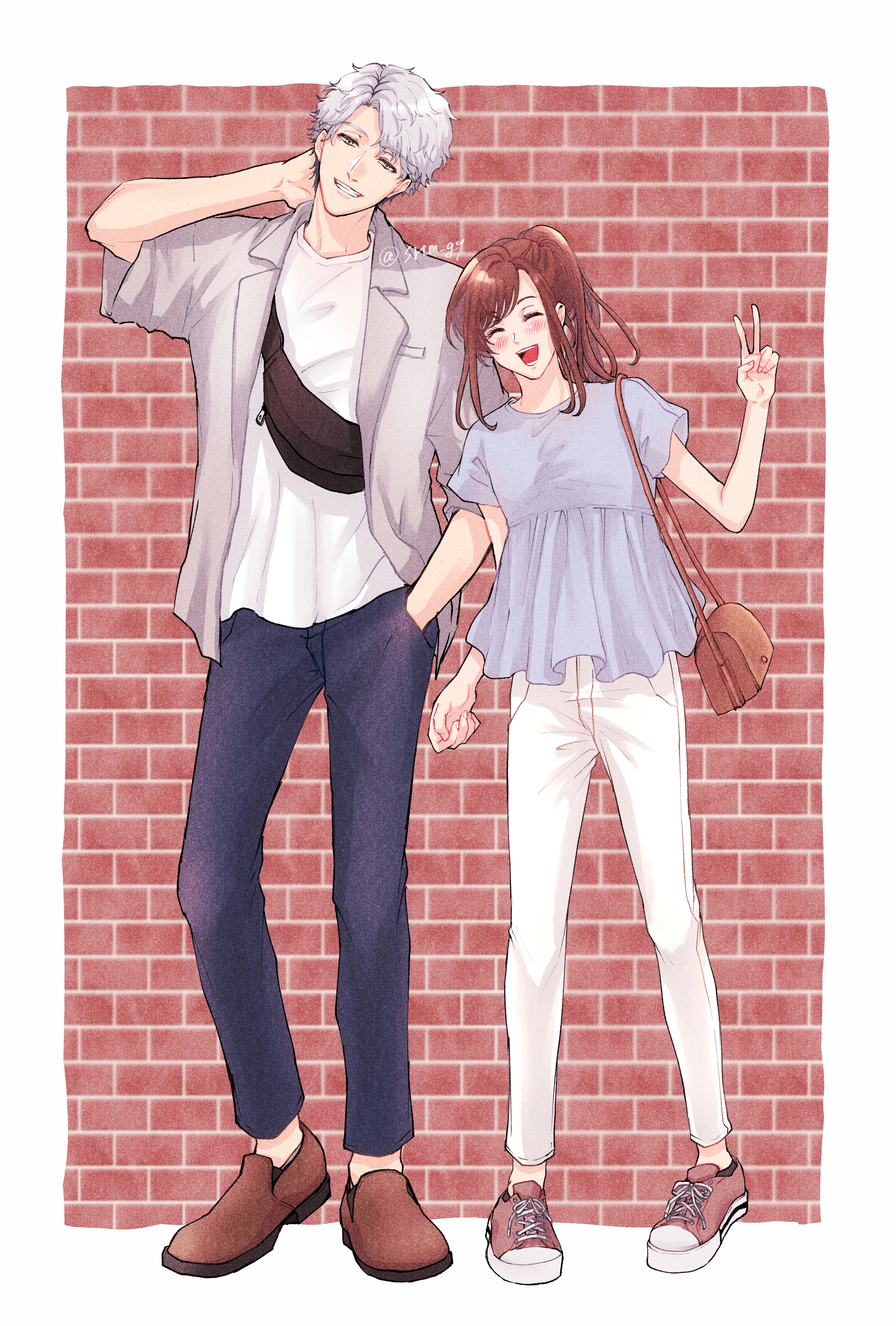 1boy 1girl absurdres arm_behind_head asahina_yui bag brick_wall brown_footwear brown_hair closed_eyes facing_viewer fanny_pack grey_shirt hand_in_pocket hand_up handbag highres ichinose_ginga la_corda_d'oro_starlight_orchestra long_hair looking_at_viewer pants shiratama_(srtm_gy) shirt shoes smile sneakers standing v white_pants white_shirt yellow_eyes zipper
