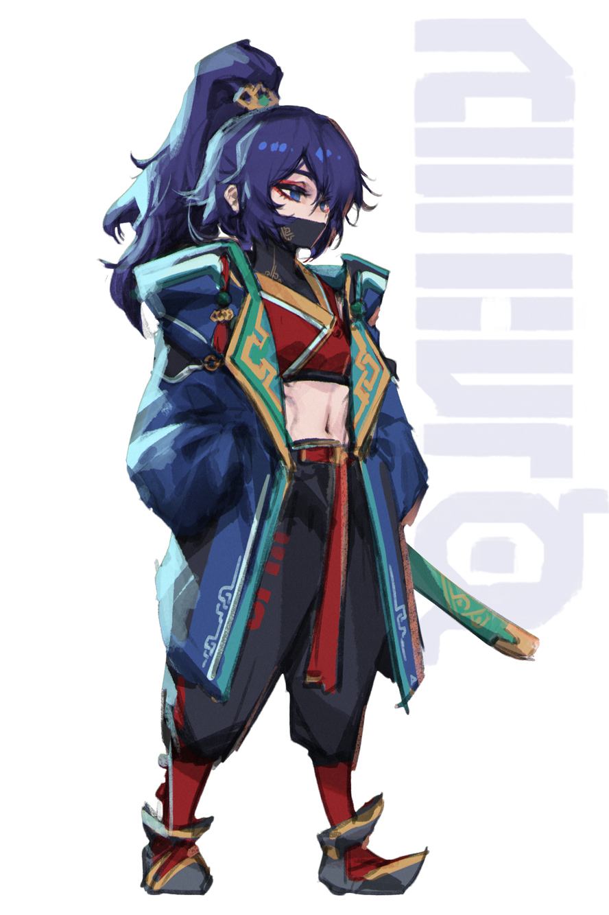 1girl belt black_pants crop_top full_body hair_between_eyes hands_in_pockets highres jacket long_hair long_sleeves mask midriff mouth_mask navel open_clothes open_jacket original pants phantom_cross ponytail purple_eyes purple_hair red_belt red_socks shoes socks solo standing stomach white_background