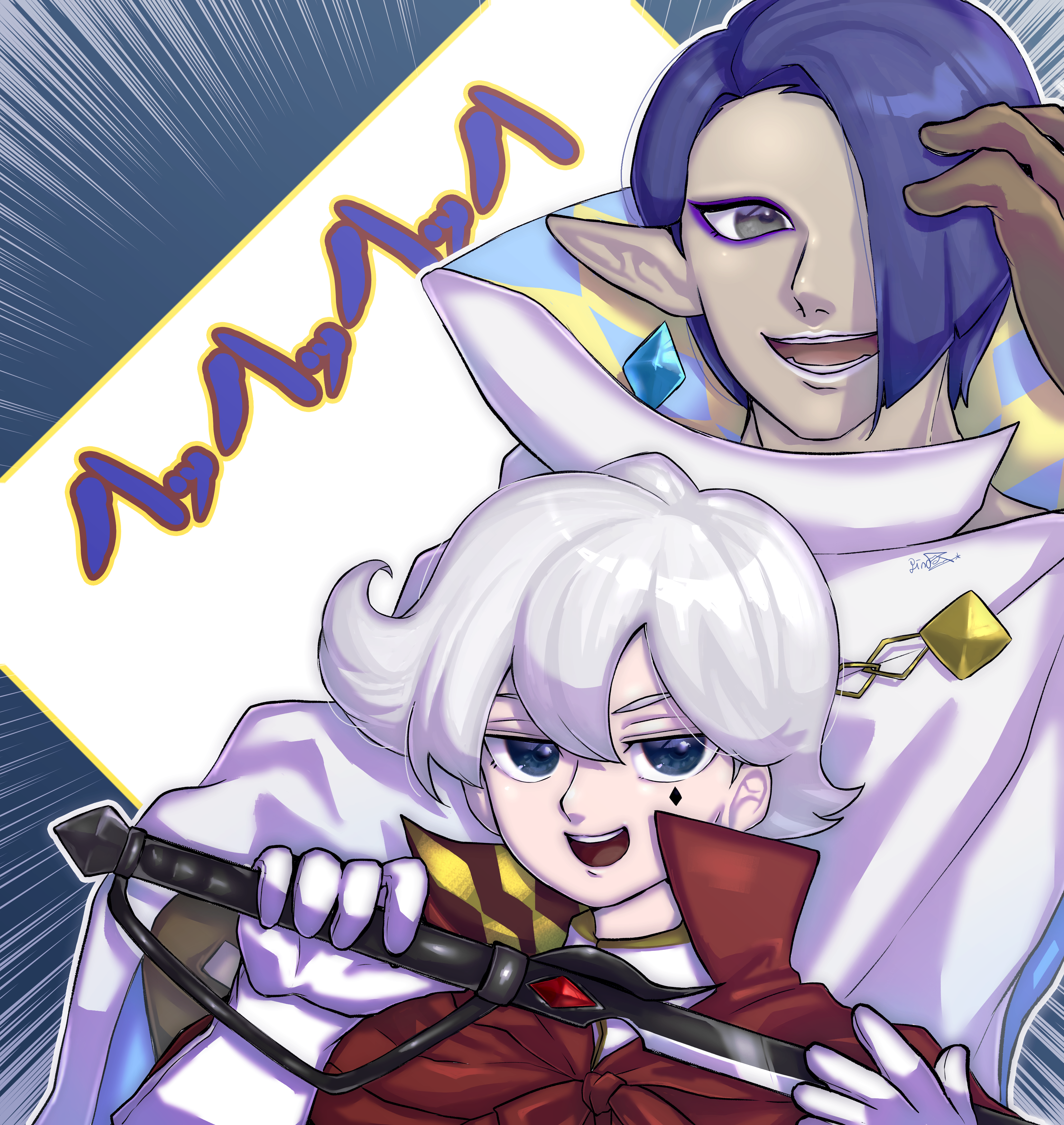 2boys absurdres alternate_color alternate_hair_color artist_name black_eyes blue_eyes blue_gem brown_gloves cape color_switch crossover earrings emphasis_lines eyeliner facial_mark gem ghirahim gloves hair_between_eyes hair_color_switch hair_over_one_eye half-closed_eyes hand_up hands_up happy high_collar highres holding holding_sword holding_weapon hyrule_warriors japanese_text jewelry kaeru_no_tame_ni_kane_wa_naru looking_at_viewer male_focus multiple_boys nintendo one_eye_covered open_mouth outline pale_skin player_2 pointy_ears prince_richard_(kaeru_no_tame_ni_kane_wa_naru) purple_eyeliner red_cape red_gem s_(esumi_kihomaru) short_hair sidelocks signature smile sword teeth the_legend_of_zelda the_legend_of_zelda:_skyward_sword translated two-tone_background upper_body weapon white_background white_cape white_gloves white_hair white_lips white_outline