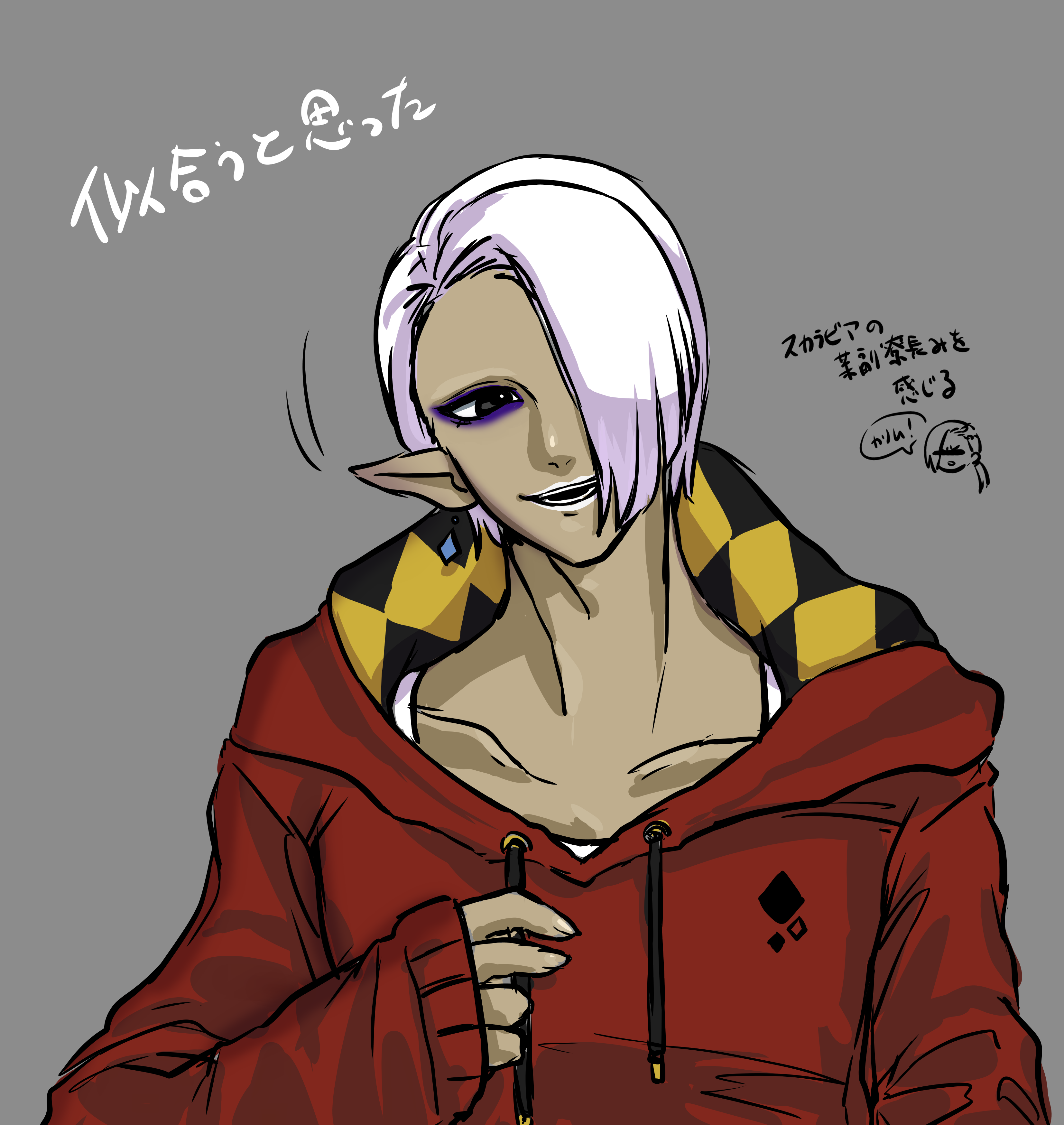 1boy absurdres alternate_costume black_eyes casual censored collarbone drawstring earrings eyeliner ghirahim grey_background hair_over_one_eye half-closed_eyes happy head_tilt highres hood hood_down hooded_sweater censored_identity impa japanese_text jewelry long_sleeves looking_to_the_side male_focus motion_lines nintendo one_eye_covered open_mouth pointy_ears purple_eyeliner red_sweater s_(esumi_kihomaru) shirt short_hair simple_background sleeves_past_wrists smile solo_focus speech_bubble standing sweater talking teeth the_legend_of_zelda the_legend_of_zelda:_skyward_sword translation_request upper_body white_hair white_lips white_shirt