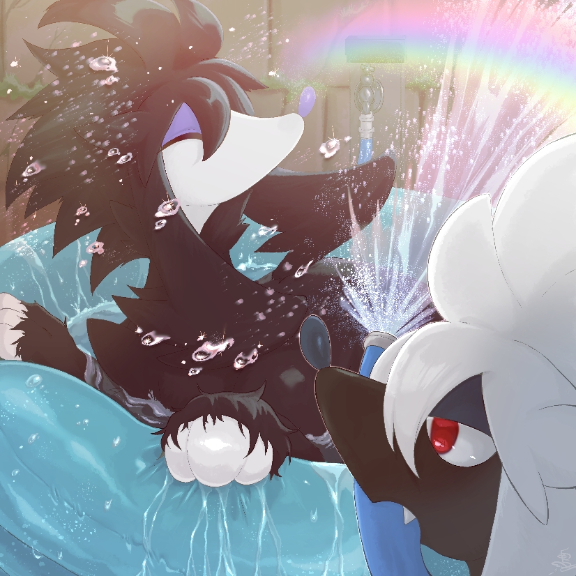 ^_^ alternate_color animal_focus black_hair closed_eyes dog fang faucet furfrou furfrou_(natural) gen_6_pokemon hose innertube long_hair mouth_hold nintendo no_humans open_mouth partially_submerged pokemon pokemon_(creature) profile rainbow s_(esumi_kihomaru) shiny_and_normal shiny_pokemon sidelocks splashing swim_ring water white_hair