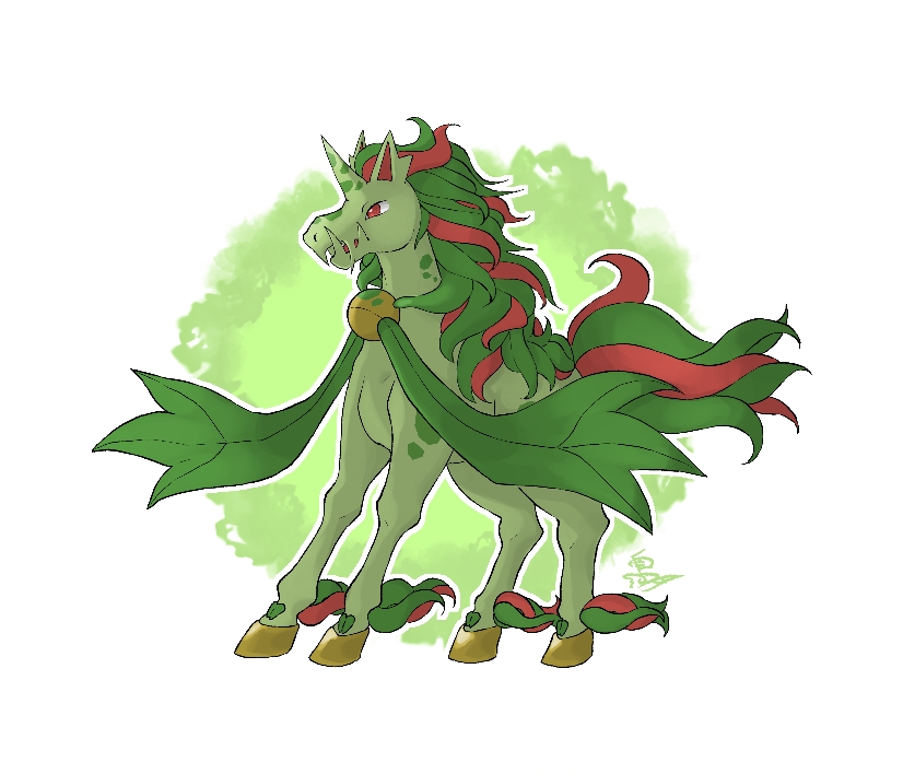 animal_focus artist_name carnivine full_body fusion gen_1_pokemon gen_4_pokemon green_background green_hair long_hair looking_to_the_side multicolored_hair nintendo no_humans open_mouth outline pokemon pokemon_(creature) rapidash red_eyes red_hair s_(esumi_kihomaru) signature solo standing two-tone_hair unicorn white_outline