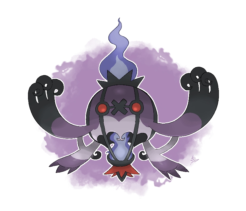 animal_focus arms_up artist_name blank_eyes chandelure drifblim fire floating full_body fusion gen_4_pokemon gen_5_pokemon looking_at_viewer nintendo no_humans outline pokemon pokemon_(creature) purple_background purple_fire red_eyes s_(esumi_kihomaru) signature solo straight-on white_outline