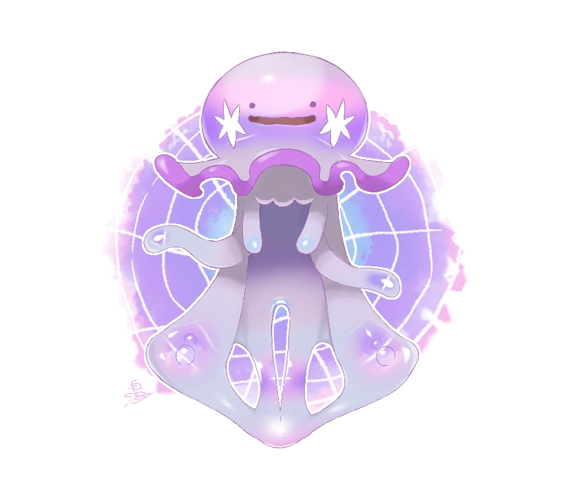 ._. animal_focus artist_name ditto floating full_body fusion gen_1_pokemon gen_7_pokemon happy nihilego nintendo no_humans open_mouth outline pokemon pokemon_(creature) purple_background purple_eyes s_(esumi_kihomaru) signature smile solo straight-on tentacles ultra_beast white_outline