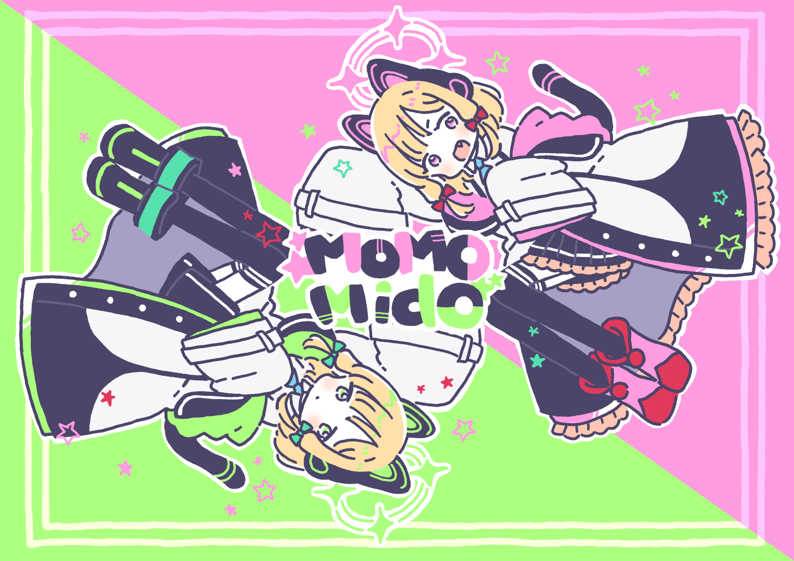 2girls animal_ear_headphones animal_ears aqua_necktie arm_up black_coat black_footwear black_skirt black_thighhighs blonde_hair blue_archive blush boots border bow cat_ear_headphones cat_ears cat_tail character_name closed_mouth coat coat_partially_removed collared_shirt commentary_request dot_mouth fake_animal_ears fake_tail fang green_background green_bow green_coat green_eyes hair_bow halo headphones highres hori00 lace lace-trimmed_coat lace-trimmed_skirt lace_trim long_sleeves looking_at_viewer medium_hair midori_(blue_archive) momoi_(blue_archive) multicolored_coat multiple_girls multiple_hair_bows necktie open_clothes open_coat outline outside_border pink_background pink_boots pink_coat pink_eyes pleated_skirt pom_pom_(clothes) red_bow rotational_symmetry shirt siblings sisters skirt sleeves_past_fingers sleeves_past_wrists smile star_(symbol) suspenders tail tareme thighhighs two-tone_background v-shaped_eyebrows white_outline white_shirt